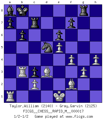 Last move : 1/2-1/2 2009 September 3 7:15:36 [Event "FICGS__CHESS__RAPID_M__000017"] [Site "FICGS"] [Date "2009.05.12"] [Round "1"] [White "Taylor,William"] [Black "Gray,Garvin"] [Result "1/2-1/2"] [WhiteElo "2140"] [BlackElo "2125"] 1.e4 e6 2.d4 d5 3.Nc3 Bb4 4.e5 c5 5.a3 Bxc3+ 6.bxc3 Ne7 7.Qg4 Qc7 8.Qxg7 Rg8 9.Qxh7 cxd4 10.Ne2 Nbc6 11.f4 dxc3 12.Qd3 d4 13.Rb1 Bd7 14.Rg1 O-O-O 15.Nxd4 Nxd4 16.Qxd4 Kb8 17.Be3 b6 18.Qc4 Bc6 19.g3 Rc8 20.a4 Nf5 21.Bf2 Qd7 22.Qd3 Bxa4 23.Qxd7 Bxd7 24.Bd3 Ne7 25.h4 Bc6 26.Ke2 Nd5 27.Rb3 Rc7 28.Ra1 Ba8 29.Ke1 1/2-1/2 French : Winawer, Advance, poisoned pawn variation Queenside Castling by player Black (move 14) This chess game ended in a draw. Follow this game move after move (download)Don't even mention losing to me. I can't stand to think of it. (Bobby Fischer) Um dein Spiel zu verbessern musst du zuallererst das Endspiel studieren, denn diese kann unabhängig studiert werden. Die Eröffnung und das Mittelspiel müssen immer in Bezug gesetzt werden zum Endspiel. (José Raúl Capablanca) Fischer es una tragedia del Ajedrez Americano a la par con Morphy y Pillsbury. (Mig Greengard) La tactique est l'élément le plus important du milieu de jeu. (Siegbert Tarrasch) Life doesn't imitate art, it imitates bad television. (Woody Allen)