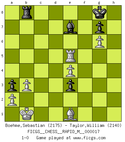 Last move : 1-0 2009 November 2 1:27:31 [Event "FICGS__CHESS__RAPID_M__000017"] [Site "FICGS"] [Date "2009.05.12"] [Round "1"] [White "Boehme,Sebastian"] [Black "Taylor,William"] [Result "1-0"] [WhiteElo "2175"] [BlackElo "2140"] 1.e4 c5 2.Nf3 d6 3.d4 cxd4 4.Nxd4 Nf6 5.Nc3 a6 6.Be3 e5 7.Nb3 Be6 8.f3 Nbd7 9.g4 b5 10.g5 b4 11.Nd5 Nxd5 12.exd5 Bf5 13.h4 Be7 14.Bd3 Bxd3 15.Qxd3 a5 16.O-O-O a4 17.Nd2 O-O 18.Kb1 f5 19.Qc4 Rb8 20.Qa6 a3 21.b3 f4 22.Bf2 Qc8 23.Qe2 Nb6 24.Ne4 Na8 25.Rd3 Nc7 26.Rhd1 Qb7 27.Qf1 Qb5 28.Qh3 Kh8 29.Qg4 Rfd8 30.h5 Rb7 31.Qf5 Rf8 32.Qh3 Rd8 33.Be1 Qd7 34.Qxd7 Rxd7 35.g6 Kg8 36.c4 bxc3 37.Rxc3 Rb5 38.Rdc1 Rb7 39.R3c2 hxg6 40.hxg6 Nxd5 41.Rd2 Ne3 42.Rc8+ Rd8 43.Rxd8+ Bxd8 44.Nxd6 Rb6 45.Nc4 Rb8 46.Nxe3 fxe3 47.Rd5 e4 48.fxe4 Be7 49.Re5 1-0 Sicilian : Najdorf, Byrne (English) attack Queenside Castling by player White (move 16) Kingside Castling by player Black (move 17) Player White won this chess game. Follow this game move after move (download)All Chess players should have a hobby. (Savielly Tartakower) Gewöhnliche Menschen denken nur daran, wie sie ihre Zeit verbringen. Ein intelligenter Mensch versucht, sie auszunutzen. (Arthur Schopenhauer) Todo lo que importa ante el tablero de Ajedrez son buenas jugadas. (Bobby Fischer) Votre seul travail dans les ouvertures est d'obtenir un milieu de partie jouable. (Lajos Portish) Somewhere in the world there is an epigram for every dilemma. (Hendrik Willem van Loon)