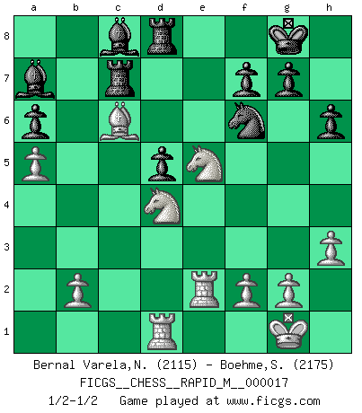Last move : 1/2-1/2 2009 August 17 4:16:16 [Event "FICGS__CHESS__RAPID_M__000017"] [Site "FICGS"] [Date "2009.05.12"] [Round "1"] [White "Bernal Varela,Nelson"] [Black "Boehme,Sebastian"] [Result "1/2-1/2"] [WhiteElo "2115"] [BlackElo "2175"] 1.e4 e6 2.d4 d5 3.Nd2 Be7 4.Ngf3 Nf6 5.Bd3 c5 6.exd5 exd5 7.dxc5 Bxc5 8.Nb3 Qe7+ 9.Qe2 Qxe2+ 10.Kxe2 Bd6 11.h3 O-O 12.Re1 Na6 13.a3 b6 14.Nbd4 Nc5 15.Bb5 a6 16.Bc6 Ra7 17.Kf1 Rc7 18.Bg5 Nce4 19.Bxf6 Nxf6 20.Kg1 b5 21.c3 h6 22.Rad1 Bc5 23.Re2 Rd8 24.a4 b4 25.cxb4 Bxb4 26.Ne5 Ba5 27.Nb3 Bb6 28.a5 Ba7 29.Nd4 1/2-1/2 French : Tarrasch Kingside Castling by player Black (move 11) This chess game ended in a draw. Follow this game move after move (download)There is no remorse like the remorse of Chess. (H. G. Wells) Es gibt nur zwei wahre Schachgenies - das andere war Wilhelm Steinitz, der Weltmeister von 1872 bis 1894. (Robert James Fischer) Fischer era un maestro de claridad y un Rey del posicionamiento astuto. Sus oponentes podían ver hacia donde se dirigía pero eran impotentes para detenerlo. (Bruce Pandolfini) Pour moi, les échecs ne sont pas un jeu mais un art. (Alexandre Alekhine) Wikichess, chess moves explained by 'experimented' players. (Thibault de Vassal)
