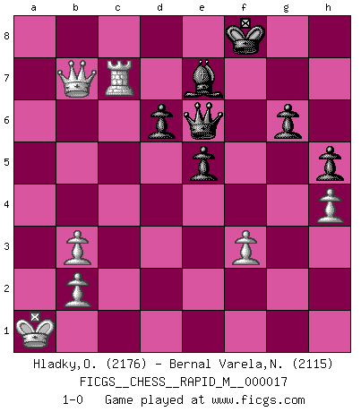 Last move : 1-0 2009 August 16 7:8:55 [Event "FICGS__CHESS__RAPID_M__000017"] [Site "FICGS"] [Date "2009.05.12"] [Round "1"] [White "Hladky,Ostap"] [Black "Bernal Varela,Nelson"] [Result "1-0"] [WhiteElo "2176"] [BlackElo "2115"] 1.e4 c5 2.Nf3 d6 3.d4 cxd4 4.Nxd4 Nf6 5.Nc3 a6 6.f3 e5 7.Nb3 Be7 8.Be3 Be6 9.Qd2 Nbd7 10.g4 O-O 11.g5 Nh5 12.O-O-O b5 13.Kb1 Qc7 14.Nd5 Bxd5 15.exd5 Nb6 16.Na5 Nxd5 17.Qxd5 Qxa5 18.Bd3 Rac8 19.c4 Qd8 20.cxb5 axb5 21.h4 b4 22.Rhe1 g6 23.Ba6 Ra8 24.Bb7 Rb8 25.Ba7 Nf4 26.Qc6 Qe8 27.Qe4 b3 28.axb3 Qb5 29.Bxb8 Rxb8 30.Bd5 Kg7 31.Re3 Qa5 32.Qa4 Qb5 33.Qc4 f6 34.Qc7 Nxd5 35.Rxd5 Qxd5 36.gxf6+ Kxf6 37.Qxb8 h5 38.Qb4 Ke6 39.Qa4 Kf6 40.Rc3 Qd1+ 41.Ka2 Qd5 42.Rc7 Kf7 43.Qa7 Qe6 44.Qb7 Kf8 45.Ka1 1-0 Sicilian : Najdorf Kingside Castling by player Black (move 10) Queenside Castling by player White (move 12) Player White won this chess game. Follow this game move after move (download)It is difficult to play against Einstein's theory --on his first loss to Fischer. (Mikhail Tal) Ich hatte meine größten Erfolge, als ich 47 Jahre alt war. Kasparow war noch nicht mal 42 und hat das Schach schon im Stich gelassen. (Viktor Kortschnoi) Los tropiezos estan todos ahí en el tablero, esperando que se cometan. (Savielly Tartakover) Ce qui caractérise les parties de combat, c'est que si le défenseur a constamment de difficiles problèmes à résoudre, l'attaquant doit chercher sans relâche de nouvelles possibilités d'attaque. (Koblentz) You can't play chess if you're groggy from pills. (Anatoly Karpov)