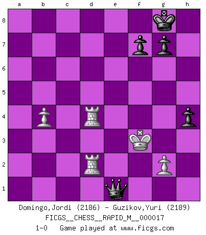 Last move : 1-0 2009 September 27 22:3:49 [Event "FICGS__CHESS__RAPID_M__000017"] [Site "FICGS"] [Date "2009.05.12"] [Round "1"] [White "Domingo,Jordi"] [Black "Guzikov,Yuri"] [Result "1-0"] [WhiteElo "2186"] [BlackElo "2189"] 1.e4 e6 2.d4 d5 3.Nc3 Nf6 4.e5 Nfd7 5.f4 c5 6.Nf3 Nc6 7.Be3 cxd4 8.Nxd4 Bc5 9.Qd2 O-O 10.O-O-O a6 11.Qf2 Qe7 12.Kb1 Nxd4 13.Bxd4 b5 14.Bd3 b4 15.Ne2 a5 16.Bb5 a4 17.f5 Bxd4 18.Qxd4 b3 19.Nc3 bxc2+ 20.Kxc2 Rb8 21.Rhf1 Rxb5 22.Nxb5 Ba6 23.fxe6 Qxe6 24.Qxd5 Qg6+ 25.Kc3 Nb6 26.Qc5 Bxb5 27.Qxb5 Rc8+ 28.Kd4 Rc4+ 29.Qxc4 Nxc4 30.Kxc4 h5 31.Rf2 Qc6+ 32.Kd3 Qd5+ 33.Ke2 Qxe5+ 34.Kf3 Qxh2 35.Rd4 Qg1 36.Rfd2 Qe1 37.b3 axb3 38.axb3 h4 39.b4 1-0 This chess game has been lost on time (started : 2009.05.12 21:42:53) French : Steinitz, Boleslavsky variation Kingside Castling by player Black (move 9) Queenside Castling by player White (move 10) 10 pieces endgame at move 38 : White KRRPP , Black KQPPP WHITE : King + 2 Rooks 2 Pawns BLACK : King + 1 Queen 3 Pawns Player White won this chess game. Follow this game move after move (download)All I want to do, ever, is just play Chess. (Bobby Fischer) Ohne ihre Erfolge schmälern zu wollen würde ich sagen Petrosian, Spassky und Karpov verdanken ihre Siege ihren Trainern - Boleslavsky, Bondarevsky und Furman. (Mikhail Moiseyevich Botvinik) Solo el jugador con la iniciativa tiene el derecho a atacar. (Wilhelm Steinitz) Aucun coup ne doit être joué sans but. (Pedro Damiano) Macintosh - we might not get everything right, but at least we knew the century was going to end. (Douglas Adams)