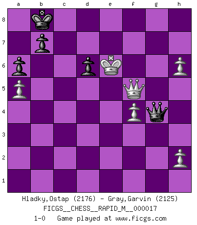 Last move : 1-0 2009 September 15 11:45:35 [Event "FICGS__CHESS__RAPID_M__000017"] [Site "FICGS"] [Date "2009.05.12"] [Round "1"] [White "Hladky,Ostap"] [Black "Gray,Garvin"] [Result "1-0"] [WhiteElo "2176"] [BlackElo "2125"] 1.d4 Nf6 2.c4 e6 3.Nf3 c5 4.d5 exd5 5.cxd5 d6 6.Nc3 g6 7.e4 a6 8.a4 Bg4 9.Be2 Bxf3 10.Bxf3 Nbd7 11.O-O Bg7 12.Bf4 Qe7 13.Qd2 O-O 14.Rfe1 c4 15.Be2 Rac8 16.f3 Nh5 17.Bg5 Bd4+ 18.Kh1 Bf6 19.Bh6 Bg7 20.Bxg7 Kxg7 21.g3 Nhf6 22.Qd4 Qd8 23.a5 Qc7 24.Nd1 Qc5 25.Qc3 Ne5 26.Ne3 Rc7 27.Ra4 h5 28.Rf1 Kg8 29.Nxc4 Re8 30.Kg2 h4 31.b3 Rec8 32.gxh4 Qb5 33.Kh1 Qe8 34.Rb4 Nxc4 35.Qxf6 Ne3 36.Rg1 Nxd5 37.exd5 Qxe2 38.Re4 Qd2 39.Rf4 Re7 40.Rfg4 Re1 41.Rxg6+ fxg6 42.Qxg6+ Kf8 43.Qf5+ Ke7 44.Qxc8 Rxg1+ 45.Kxg1 Qxd5 46.Qc3 Kd7 47.Kg2 Kd8 48.Qh8+ Kc7 49.Qg7+ Kb8 50.Qg5 Qe6 51.h5 Qe2+ 52.Kg3 Qe1+ 53.Kf4 Qd2+ 54.Kf5 Qc2+ 55.Kf6 Qxb3 56.f4 Qc3+ 57.Kg6 Qc8 58.h6 Qg8+ 59.Kf6 Qf8+ 60.Ke6 Qe8+ 61.Qe7 Qg6+ 62.Qf6 Qg8+ 63.Qf7 Qg4+ 64.Qf5 1-0 Queen's pawn game Kingside Castling by player White (move 11) Kingside Castling by player Black (move 13) Player White won this chess game. Follow this game move after move (download)Bobby just drops the pieces and they fall on the right squares. (Miguel Najdorf) Ja, jede Frau in Holland liebt mich bestimmt, und alle Männer hassen mich. (Loek van Wely) Jugadores de primera clase pierden en contra de jugadores de segunda clase porque los jugadores de segunda clase a veces juegan una partida de primer clase. (Siegbert Tarrasch) Les Echecs mettent en conflit, non pas deux intelligences, mais deux volontés. (Lasker) The problem with troubleshooting is that trouble shoots back. (Anonymous)