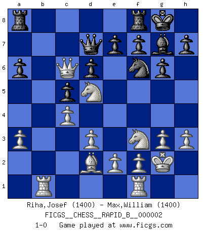 Last move : 1-0 2006 April 20 21:47:48 [Event "FICGS__CHESS__RAPID_B__000002"] [Site "FICGS"] [Date "2006.04.19"] [Round "1"] [White "Riha,Josef"] [Black "Max,William"] [Result "1-0"] [WhiteElo "1400"] [BlackElo "1400"] 1.c4 c5 2.Nc3 g6 3.g3 Bg7 4.Bg2 Nc6 5.d3 Nf6 6.Nf3 O-O 7.O-O d6 8.a3 Bd7 9.Bd2 Qc8 10.Rb1 Bh3 11.b4 Bxg2 12.Kxg2 b6 13.h3 a6 14.bxc5 bxc5 15.Qa4 Qc7 16.Nd5 Qd7 17.Qxc6 1-0 English : Symmetrical variation Kingside Castling by player Black (move 6) Kingside Castling by player White (move 7) Player White won this chess game. Follow this game move after move (download)There are two types of sacrifices: correct ones and mine. (Mikhail Tal) Im Schach nämlich geht es darum, daß Ich des Gegners klein zu kriegen, sein Ego zu zerbrechen und zu zermahlen, seine Selbstachtung zu zertreten und zu verscharren und seine ganze mißachtenswerte sogenannte Persönlichkeit ein für alle Mal tot zu hacken und zu zerstampfen und dadurch die menschliche Gesellschaft von einer stinkenden Pestbeule zu befreien. Es ist ein königliches Spiel. (Robert James Fischer) La pasion por jugar al Ajedrez es una de las mas inexplicables en el mundo. (H.G. Wells) Les échecs sont plus proches de l'art de l'assassinat que de l'art de la guerre. (Arturo Perez-Reverte) A government big enough to give you everything you want is strong enough to take everything you have. (Thomas Jefferson)