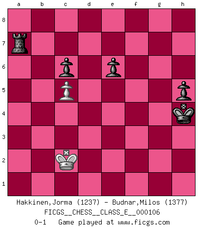 Last move : 0-1 2009 September 4 9:16:51 [Event "FICGS__CHESS__CLASS_E__000106"] [Site "FICGS"] [Date "2009.05.14"] [Round "1"] [White "Hakkinen,Jorma"] [Black "Budnar,Milos"] [Result "0-1"] [WhiteElo "1237"] [BlackElo "1377"] 1.d4 d5 2.c4 Nf6 3.Nf3 Bg4 4.Nc3 e6 5.Bg5 h6 6.Bf4 Bb4 7.a3 Bxc3+ 8.bxc3 dxc4 9.e3 O-O 10.Bxc4 Nc6 11.O-O Ne4 12.Rc1 Bxf3 13.Qxf3 Nd2 14.Qg3 Nxf1 15.Bxf1 Rc8 16.Bb5 a6 17.Bxc6 bxc6 18.Rb1 f6 19.Rb7 Rf7 20.Ra7 g5 21.Bxc7 Rc8xc7 22.Rxa6 Rb7 23.h3 Rb1+ 24.Kh2 Qc7 25.Qxc7 Rxc7 26.c4 Kf7 27.a4 Ra1 28.c5 f5 29.a5 f4 30.exf4 gxf4 31.g3 fxg3 32.Kxg3 Kg6 33.h4 h5 34.Kf3 Kf5 35.Ra8 Ra3+ 36.Kg2 Kg4 37.a6 Rg7 38.Kf1 Kxh4 39.f4 Rf7 40.a7 Rxf4+ 41.Ke1 Rxd4 42.Ke2 Rb4 43.Kd2 Rba4 44.Kc2 Rxa7 45.Rxa7 Rxa7 0-1 QGD : Marshall defense Kingside Castling by player Black (move 9) Kingside Castling by player White (move 11) 10 pieces endgame at move 41 : White KRPP , Black KRRPPP WHITE : King + 1 Rook 2 Pawns BLACK : King + 2 Rooks 3 Pawns 9 pieces endgame at move 44 : White KRP , Black KRRPPP WHITE : King + 1 Rook 1 Pawn BLACK : King + 2 Rooks 3 Pawns 8 pieces endgame at move 45 : White KRP , Black KRPPP WHITE : King + 1 Rook 1 Pawn BLACK : King + 1 Rook 3 Pawns 7 pieces endgame at move 45 : White KP , Black KRPPP WHITE : King + 1 Pawn BLACK : King + 1 Rook 3 Pawns Player Black won this chess game. Follow this game move after move (download)Whoever sees no other aim in the game than that of giving checkmate to one's opponent will never become a good Chess player. (Euwe) Wer sich die Fähigkeit anerziehen will im Schach selbstständig zu denken, der muß alles meiden, was leblos ist: ausgeklügelte Theorien, die sich auf sehr wenige Beispiele und eine Menge Hirngespinste stützen. (Emanuel Lasker) Cuando no sepas que mover, espera por una idea que se le venga a la la cabeza de tu oponente. Tenlo por seguro de que esa idea estará incorrecta. (Siegbert Tarrasch) Des idées, des idées, j'en ai cent, j'en ai mille. Des bonnes, des mauvaises, applicables, irréalisables... Il suffit de faire le tri ! (Roos) Nothing is more important for teaching us to understand the concepts we have than constructing fictitious ones. (Ludwig Wittgenstein)