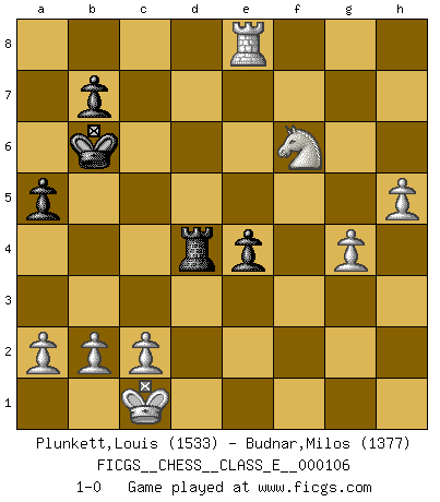 Last move : 1-0 2009 August 13 8:5:11 [Event "FICGS__CHESS__CLASS_E__000106"] [Site "FICGS"] [Date "2009.05.14"] [Round "1"] [White "Plunkett,Louis"] [Black "Budnar,Milos"] [Result "1-0"] [WhiteElo "1533"] [BlackElo "1377"] 1.Nf3 Nc6 2.g3 d6 3.d4 Bg4 4.Bg2 Bxf3 5.Bxf3 d5 6.Bf4 e6 7.Qd2 Bd6 8.Nc3 Bxf4 9.Qxf4 a6 10.O-O-O Nf6 11.h4 Qd6 12.Qg5 Rf8 13.Qxg7 Rg8 14.Qxf6 Rg6 15.Qh8+ Qf8 16.Qxh7 O-O-O 17.h5 Qh6+ 18.Qxh6 Rxh6 19.e4 dxe4 20.Bxe4 Nxd4 21.g4 f6 22.f4 e5 23.fxe5 fxe5 24.Rdf1 Kb8 25.Rf7 Ne6 26.Rhf1 Ng5 27.Re7 Nxe4 28.Nxe4 Rd5 29.Rf8+ Ka7 30.Rxc7 a5 31.R7c8 Rd4 32.Ra8+ Kb6 33.Rf6+ Rxf6 34.Nxf6 e4 35.Re8 1-0 Reti Opening Queenside Castling by player White (move 10) Queenside Castling by player Black (move 16) Player White won this chess game. Follow this game move after move (download)If you aren't afraid of Spassky, then I have removed the element of money. (Jim Slater) Gegen einen Schachcomputer zu verlieren ist wie Löcher in den Strümpfen zuhaben. Es ist nicht peinlich, solange man der einzige ist der es weiß. (Anonymous) El arma más poderosa en el Ajedrez, es tener la próxima movida. (David Bronstein) Les Echecs sont et restent toujours un combat, un combat intégral comme la boxe, la lutte ou un autre sport, et où il doit y avoir un vainqueur et un vaincu. (Joseph Emil Diemer) The obstacle is the path. (Zen proverb)