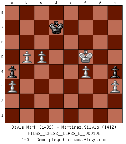 Last move : 1-0 2009 November 30 23:13:50 [Event "FICGS__CHESS__CLASS_E__000106"] [Site "FICGS"] [Date "2009.05.14"] [Round "1"] [White "Davis,Mark"] [Black "Martinez,Silvio"] [Result "1-0"] [WhiteElo "1492"] [BlackElo "1412"] 1.e4 e5 2.Nf3 Nc6 3.Nc3 Nf6 4.d4 d5 5.Bb5 Bd7 6.Bxc6 Bxc6 7.dxe5 dxe4 8.Qxd8+ Rxd8 9.Nd2 Ng4 10.Ndxe4 Bb4 11.O-O O-O 12.Bg5 Rde8 13.Bf4 a5 14.a3 Bxc3 15.Nxc3 Nxe5 16.Rfe1 f6 17.Rad1 b5 18.Nd5 Bxd5 19.Rxd5 c6 20.R5d1 g5 21.Bg3 Nc4 22.Rxe8 Rxe8 23.h3 f5 24.Rb1 f4 25.Bh2 h6 26.g3 fxg3 27.Bxg3 Nd2 28.Rd1 Nf3+ 29.Kg2 Ne5 30.Rd6 h5 31.Bxe5 Rxe5 32.Rxc6 Kf7 33.Ra6 a4 34.Kf3 Rf5+ 35.Kg2 h4 36.b4 Ke7 37.Rb6 Kd7 38.Kf1 Kc7 39.Rg6 Kd7 40.Kg2 Ke7 41.f3 Kf7 42.Rb6 Rd5 43.Kf1 Ke7 44.Ke2 Kd7 45.Ke3 Re5+ 46.Kd4 Rf5 47.Ke4 Rf4+ 48.Ke3 Kc7 49.Rxb5 Rf6 50.Rxg5 Kd6 51.Ra5 Re6+ 52.Kd4 Kc6 53.Ra6+ Kd7 54.Rxe6 Kxe6 55.f4 Kf5 56.Ke3 Kf6 57.Ke4 Ke6 58.c4 Kd6 59.Kf5 Ke7 60.c5 Kd7 61.b5 1-0 Four knights : Scotch variation Kingside Castling by player White (move 11) Kingside Castling by player Black (move 11) 10 pieces endgame at move 54 : White KRPPPPP , Black KPP WHITE : King + 1 Rook 5 Pawns BLACK : King + 2 Pawns 9 pieces endgame at move 54 : White KPPPPP , Black KPP WHITE : King + 5 Pawns BLACK : King + 2 Pawns Player White won this chess game. Follow this game move after move (download)You know you're going to lose. Even when I was ahead I knew I was going to lose. - On playing against Fischer. (Andrew Soltis) Er war ein guter Schachspieler, aber ich kann Leute nicht ausstehen, die 'Heil Hitler' rufen (Über Alexander Aljechin). (Miguel Najdorf) Haz el enroque temprano y seguido. (Rob Sillars) On n'a jamais que l'âge auquel on a commence à jouer aux échecs car après on cesse de vieillir. (Capablanca) Ah, the Socrating method. The best way we have of teaching everything-apart from juggling chainsaws. (Gregory House, House M.D.)