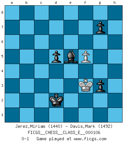 Last move : 0-1 2010 May 2 23:50:16 [Event "FICGS__CHESS__CLASS_E__000106"] [Site "FICGS"] [Date "2009.05.14"] [Round "1"] [White "Jerez,Miriam"] [Black "Davis,Mark"] [Result "0-1"] [WhiteElo "1440"] [BlackElo "1492"] 1.e4 e5 2.Nf3 Nc6 3.d4 exd4 4.Nxd4 Nxd4 5.Qxd4 d6 6.Nc3 Bg4 7.Be2 Bxe2 8.Nxe2 Nf6 9.O-O Be7 10.c4 O-O 11.b3 Re8 12.Bf4 Qc8 13.g3 Qg4 14.Rfe1 Nh5 15.Nc3 Nxf4 16.Nd5 Bd8 17.Nxf4 Qf3 18.Qe3 Qg4 19.Qe2 Qd7 20.a4 Bf6 21.Rab1 Qc6 22.b4 Qxa4 23.Nd5 Bd8 24.Ra1 Qd7 25.Rab1 c6 26.Nc3 Qh3 27.Qf1 Qg4 28.Qe2 Qxe2 29.Rxe2 Bb6 30.Na4 Bc7 31.b5 c5 32.h4 Re5 33.b6 axb6 34.Nxb6 Rd8 35.Nd5 Bb8 36.f4 R5e8 37.Rxb7 Kf8 38.Kg2 h6 39.f5 f6 40.g4 Rc8 41.Nb6 Rcd8 42.Nd7+ Rxd7 43.Rxd7 Re7 44.Rxe7 Kxe7 45.Rb2 Bc7 46.Rb7 Kd7 47.Kf3 Kc6 48.Rb5 Kd7 49.Ke3 Kc8 50.Kd3 Kd7 51.Ke3 Kc8 52.g5 hxg5 53.hxg5 fxg5 54.Kf3 Bd8 55.Rb2 Bf6 56.Ra2 Kb7 57.Ra3 Kb6 58.Rb3+ Kc6 59.Kg4 Kc7 60.Rd3 Kc6 61.Kh5 Kd7 62.Kg6 Ke7 63.Rd2 Kd7 64.Kf7 Be5 65.Kg6 Bf4 66.Rd3 g4 67.Rd1 Be5 68.Kg5 g3 69.Rd2 Ke7 70.Ra2 Kf8 71.Kg4 Kg8 72.Kf3 Kf7 73.Kg2 Kf6 74.Ra8 Kg5 75.Kh3 Kf4 76.Kg2 Kxe4 77.Rf8 Kd4 78.Rh8 Kxc4 79.Rh4+ Kd5 80.Ra4 c4 81.Kf3 Kd4 82.Rb4 Kd3 83.Ra4 c3 84.Ra3 Kd2 85.Ra1 c2 86.Rh1 c1Q 87.Rxc1 Kxc1 88.Kg2 Kd2 89.Kf3 d5 0-1 Scotch game Kingside Castling by player White (move 9) Kingside Castling by player Black (move 10) 10 pieces endgame at move 76 : White KRPP , Black KBPPPP WHITE : King + 1 Rook 2 Pawns BLACK : King + 1 Bishop 4 Pawns 9 pieces endgame at move 78 : White KRP , Black KBPPPP WHITE : King + 1 Rook 1 Pawn BLACK : King + 1 Bishop 4 Pawns Promotion Queen by player Black (move 86) 8 pieces endgame at move 87 : White KRP , Black KBPPP WHITE : King + 1 Rook 1 Pawn BLACK : King + 1 Bishop 3 Pawns 7 pieces endgame at move 87 : White KP , Black KBPPP WHITE : King + 1 Pawn BLACK : King + 1 Bishop 3 Pawns Player Black won this chess game. Follow this game move after move (download)Those who say they understand Chess, understand nothing. (Robert Hubner) Kasparov ist eine Art Monster mit hundert Augen, denen auch nicht das Geringste entgeht. (Tony Miles) Un buen jugador siempre tiene buena suerte. (José Raúl Capablanca) L'action d'une oeuvre littéraire se déroule sur un champ de bataille. Les masques et les types du drame moderne correspondent aux pièces du jeu d'échecs. L'intrigue correspond aux coups et aux gambits, c'est à dire aux techniques du jeu telles qu'utilisées et interprétées par les joueurs. Les tactiques et les péripéties [mouvements] correspondent aux coups exécutés par l'adversaire. (Viktor Shklovsky) An expert is a man who has made all the mistakes which can be made in a very narrow field. (Niels Bohr)