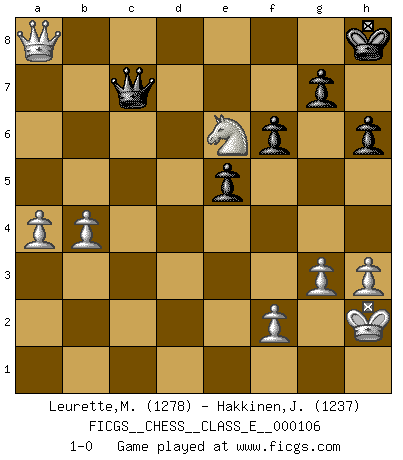 Last move : 1-0 2009 May 22 13:19:7 [Event "FICGS__CHESS__CLASS_E__000106"] [Site "FICGS"] [Date "2009.05.14"] [Round "1"] [White "Leurette,Marc-Antoine"] [Black "Hakkinen,Jorma"] [Result "1-0"] [WhiteElo "1278"] [BlackElo "1237"] 1.e4 c6 2.d4 d5 3.exd5 cxd5 4.Nf3 Nf6 5.Bb5+ Nc6 6.Ne5 Bd7 7.Bxc6 bxc6 8.O-O e6 9.Bg5 Be7 10.Nc3 Ne4 11.Bxe7 Qxe7 12.Nxe4 dxe4 13.Qg4 O-O 14.Qxe4 Rac8 15.Rfe1 c5 16.dxc5 Rxc5 17.Qb7 Rd8 18.Rad1 Rxc2 19.Qxa7 Qf6 20.Rxd7 Rxd7 21.Nxd7 Qd8 22.Rd1 Qc8 23.Qd4 Rc1 24.h3 h6 25.a4 Qc7 26.Rxc1 Qxc1+ 27.Kh2 Qc7+ 28.g3 f6 29.b4 e5 30.Qd5+ Kh8 31.Qa8+ Kh7 32.Nf8+ Kh8 33.Ne6 1-0 Caro-Kann : Exchange variation Kingside Castling by player White (move 8) Kingside Castling by player Black (move 13) Player White won this chess game. Follow this game move after move (download)For surely of all the drugs in the world, Chess must be the most permanently pleasurable. (Assiac) Die westlichen Werte sind eine Sprache, welche die Putin-Administration nicht versteht. (Garry Kasparov) Con el fin de mejorar tu juego, debes de estudiar los finales antes que todo, ya que mientras que los finales pueden ser estudiados y dominados por sí mismos, el juegomedio y la apertura deben de ser estudiados en relación con los finales. (José Raúl Capablanca) Les Echecs mettent en conflit, non pas deux intelligences, mais deux volontés. (Lasker) When you don't know what to do, walk fast and look worried. (Anonymous)