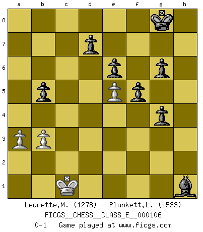 Last move : 0-1 2009 July 14 16:50:15 [Event "FICGS__CHESS__CLASS_E__000106"] [Site "FICGS"] [Date "2009.05.14"] [Round "1"] [White "Leurette,Marc-Antoine"] [Black "Plunkett,Louis"] [Result "0-1"] [WhiteElo "1278"] [BlackElo "1533"] 1.e4 c5 2.Nc3 e6 3.Nf3 a6 4.d4 cxd4 5.Qxd4 Qc7 6.Be3 Nc6 7.Qd2 Bd6 8.O-O-O Bb4 9.Bf4 Bxc3 10.Bxc7 Bxd2+ 11.Nxd2 b5 12.Bd6 Nge7 13.Bd3 Bb7 14.e5 O-O 15.Nb3 Rfe8 16.f4 Rac8 17.Nc5 Ba8 18.Nxa6 Nd4 19.Nc7 Bxg2 20.Rhg1 Bf3 21.Rde1 Rxc7 22.Bxc7 Rc8 23.Bd6 Nd5 24.a3 Nxf4 25.Kb1 Nxd3 26.cxd3 Nb3 27.Bb4 Rc6 28.Rg3 Bh5 29.Reg1 Bg6 30.Ka2 Nc1+ 31.Kb1 Bxd3+ 32.Ka1 g6 33.Bd2 Nb3+ 34.Ka2 Nc5 35.h4 h5 36.Bb4 Bc4+ 37.Kb1 Ne4 38.Re3 Bd5 39.Rf1 Rc4 40.Rfe1 f5 41.b3 Rd4 42.Bc3 Nxc3+ 43.Rxc3 Be4+ 44.Kc1 Bc6 45.Rd1 Rxh4 46.Rg3 Rg4 47.Rxg4 hxg4 48.Rh1 Bxh1 0-1 Sicilian : Closed Queenside Castling by player White (move 8) Kingside Castling by player Black (move 14) Player Black won this chess game. Follow this game move after move (download)Chess is a terrific way for kids to build self image and self esteem. (Saudin Robovic) Das Blackmar-Diemer-Gambit verändert den ganzen Menschen! (Emil Joseph Diemer) No solamente yo pronostico su triunfo sobre Botvinnik, sino que me adelanto y digo que probablemente Fischer es el jugador de Ajedrez mas grande que haya existido. (John Collins) Les écrivains ont utilisé les échecs pour analyser les côtés extrêmes de la nature humaine. Dans ce cadre, les échecs offrent un champ d'expérimentation idéal. Mais on pourrait faire la même chose avec la peinture. Et là, en vous référant à Van Gogh, vous ne tirerez pas de conclusion définitive sur les peintres. (Gary Kasparov) Your best chance to get a Royal Flush in a casino is in the bathroom. (Anonymous)