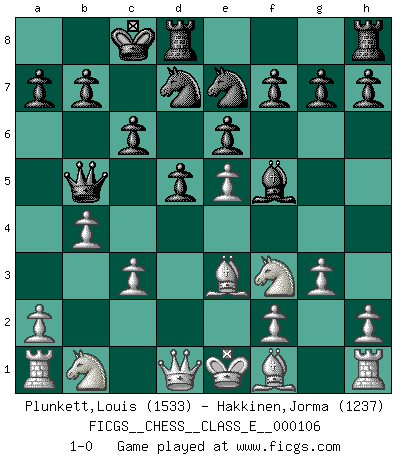 Last move : 1-0 2009 June 4 15:1:52 [Event "FICGS__CHESS__CLASS_E__000106"] [Site "FICGS"] [Date "2009.05.14"] [Round "1"] [White "Plunkett,Louis"] [Black "Hakkinen,Jorma"] [Result "1-0"] [WhiteElo "1533"] [BlackElo "1237"] 1.e4 c6 2.d3 d5 3.e5 Bf5 4.g3 e6 5.Bg2 Nd7 6.Nf3 Bc5 7.d4 Qb6 8.dxc5 Qxc5 9.c3 O-O-O 10.Be3 Qb5 11.b4 Ne7 12.Bf1 1-0 Caro-Kann : Closed (Breyer) variation Queenside Castling by player Black (move 9) Player White won this chess game. Follow this game move after move (download)A Chess game is divided into three stages: the first, when you hope you have the advantage, the second when you believe you have an advantage, and the third... when you know you're going to lose ! (Savielly Tartakower) Ich verachte die Medien. (Robert James Fischer) Existen dos clases de sacrificios: los correctos y los míos. (Mikhail Tal) Pour se monter efficace, un Cavalier a besoin d'avant-postes ! Les Cavaliers font les meilleurs bloqueurs de pions passés. Man with more than one clock never knows what time it is. (Chinese thought)