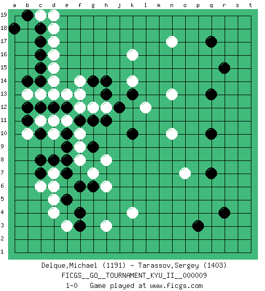 Last move : 1-0 2009 July 11 11:50:16 [Event "FICGS__GO__TOURNAMENT_KYU_II__000009"] [Site "FICGS"] [Date "2009.05.17"] [Round "1"] [Black "Delque,Michael"] [White "Tarassov,Sergey"] [Result "1-0"] [Rating 1 "1191"] [Rating 2 "1403"] 1.q17 d4 2.r4 d16 3.r15 d10 4.q10 k16 5.p3 k4 6.k10 n10 7.k13 n13 8.q13 o7 9.q7 n17 10.c14 d14 11.c15 d15 12.c16 c13 13.c17 d17 14.c18 d18 15.h14 h12 16.j12 l12 17.h13 k14 18.h11 g12 19.g11 f12 20.g9 g7 21.c8 d7 22.c7 c6 23.d8 f9 24.e8 f8 25.f3 e3 26.f4 h3 27.e7 d6 28.f6 h6 29.e5 d5 30.g6 h8 31.f11 e11 32.e12 e13 33.d12 f14 34.g14 f13 35.e10 d11 36.e9 f10 37.c12 c11 38.b12 b13 39.b11 d13 40.b14 b10 41.c10 c19 42.b19 d19 43.a18 1-0 Here are the names of the openings (joseki) played in the four corners : Corner d16 : d16 c14 Hoshi (Hwajeom, Seongjeom, Xingwei`) 4-4 Point. The star or hoshi (4-4) point, emphasizing influence at the potential expense of territory. Ikken Kakari (Hankan Keolch'im, Yi Gua`jiao~, 1-Space Low Approach). Black 2 is the standard approach move to the 4-4. Corner d4 : d4 g9 Hoshi (Hwajeom, Seongjeom, Xingwei`) 4-4 Point. The star or hoshi (4-4) point, emphasizing influence at the potential expense of territory. Player Black won this Go (weiqi, baduk) game. Follow this game move after move (download)One point in the center is worth ten in the corner. (Anonymous) Luck has a peculiar habit of favoring those who don't depend on it. (Author unknown)