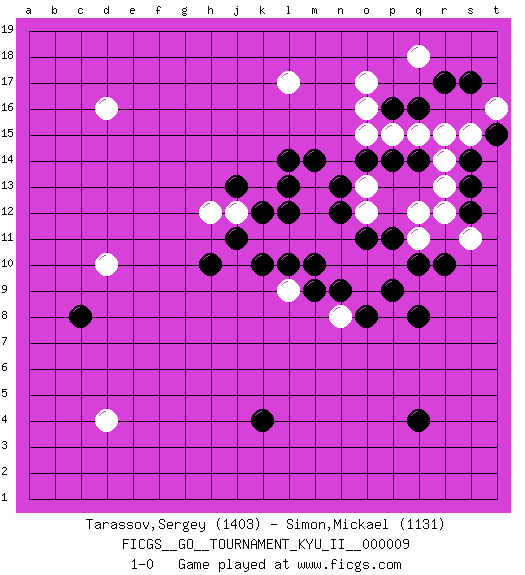 Last move : 1-0 2009 May 29 19:45:35 [Event "FICGS__GO__TOURNAMENT_KYU_II__000009"] [Site "FICGS"] [Date "2009.05.17"] [Round "1"] [Black "Tarassov,Sergey"] [White "Simon,Mickael"] [Result "1-0"] [Rating 1 "1403"] [Rating 2 "1131"] 1.q16 d4 2.q4 d16 3.q10 d10 4.k4 o17 5.q14 q18 6.r17 l17 7.k10 q12 8.o14 o12 9.m14 o10 10.p9 l9 11.o8 n8 12.n9 o9 13.m10 r12 14.r10 m12 15.l12 l11 16.l10 m11 17.k12 k11 18.j11 n10 19.m9 j12 20.j13 h12 21.h10 m13 22.l14 o13 23.p11 p10 24.q8 q11 25.o11 n11 26.n13 r14 27.s13 r15 28.s12 r13 29.s14 s15 30.s17 p15 31.p16 q15 32.p14 o15 33.c8 o16 34.t15 t16 35.l13 s11 36.n12 1-0 Here are the names of the openings (joseki) played in the four corners : Corner q16 : q16 o17 Hoshi (Hwajeom, Seongjeom, Xingwei`) 4-4 Point. The star or hoshi (4-4) point, emphasizing influence at the potential expense of territory. Ikken Kakari (Hankan Keolch'im, Yi Gua`jiao~, 1-Space Low Approach). White 2 is the standard approach move to the 4-4. Corner d16 : d16 j11 Hoshi (Hwajeom, Seongjeom, Xingwei`) 4-4 Point. The star or hoshi (4-4) point, emphasizing influence at the potential expense of territory. Corner d4 : d4 c8 Hoshi (Hwajeom, Seongjeom, Xingwei`) 4-4 Point. The star or hoshi (4-4) point, emphasizing influence at the potential expense of territory. Player Black won this Go (weiqi, baduk) game. Follow this game move after move (download)Each step in a ladder is worth 7 points. (Anonymous) Do not put your faith in what statistics say until you have carefully considered what they do not say. (William W. Watt)