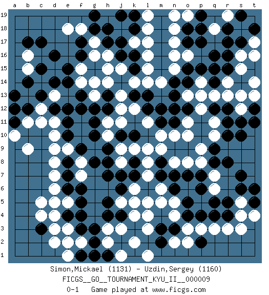 Last move : 0-1 2009 June 27 15:19:48 [Event "FICGS__GO__TOURNAMENT_KYU_II__000009"] [Site "FICGS"] [Date "2009.05.17"] [Round "1"] [Black "Simon,Mickael"] [White "Uzdin,Sergey"] [Result "0-1"] [Rating 1 "1131"] [Rating 2 "1160"] 1.q16 d4 2.d16 q3 3.r5 q7 4.p6 q6 5.q5 q10 6.o4 r14 7.o17 s16 8.r17 o2 9.n3 n2 10.m3 c14 11.f17 b16 12.c17 c11 13.j17 d7 14.f3 e3 15.f4 k4 16.m2 s4 17.s7 h3 18.h5 k6 19.h7 m5 20.n7 n5 21.o5 j8 22.j7 l8 23.h8 j9 24.e6 d6 25.h9 f8 26.j10 l9 27.s10 s12 28.r11 q11 29.r12 r13 30.q12 p14 31.o12 o10 32.n14 o13 33.n13 n12 34.n11 o11 35.m12 p12 36.n12 n8 37.p7 p8 38.q8 q13 39.r8 h10 40.g10 h11 41.f9 e9 42.e10 d10 43.e8 d9 44.e7 l16 45.s17 n16 46.o15 o16 47.p17 n17 48.p15 q15 49.r15 s15 50.q14 k14 51.q15 h14 52.e14 j11 53.k10 l11 54.f12 h16 55.h17 g16 56.f16 g17 57.g18 m14 58.b17 l18 59.c13 b13 60.b12 c12 61.b14 d13 62.a13 b15 63.c13 b11 64.c15 b13 65.p2 p3 66.c13 g9 67.g8 b13 68.o14 p13 69.c13 o3 70.d14 n4 71.k7 l7 72.l6 m6 73.k5 l5 74.j4 j3 75.j6 j5 76.h4 f2 77.c3 c4 78.e2 d2 79.g2 e1 80.g3 h2 81.g1 e5 82.f5 d8 83.h1 j1 84.k1 k2 85.k5 l1 86.l6 f7 87.f6 k6 88.k8 k9 89.l6 l3 90.e4 d3 91.d5 c5 92.e11 k6 93.j16 j15 94.d12 q18 95.p18 r19 96.r18 f18 97.h18 f15 98.g15 h15 99.e15 f14 100.f13 g14 101.n6 o8 102.o7 s5 103.s6 n10 104.l12 k12 105.l13 l14 106.k13 j13 107.l6 n18 108.m7 l4 109.m8 m9 110.s11 t13 111.s19 d11 112.e12 k6 113.r4 r3 114.k16 k17 115.k15 l15 116.k18 l17 117.j19 e18 118.g19 j5 119.t5 t4 120.t6 s3 121.a11 a10 122.a12 b9 123.g11 k5 124.h12 j12 125.q9 p9 126.p4 n15 127.m11 e5 128.r10 d5 129.h13 g13 130.g12 o19 131.p19 l19 132.k19 m10 133.o18 n19 134.t11 t17 135.t18 t16 136.r16 t14 137.t12 s13 138.f1 e2 139.q4 pass 0-1 Here are the names of the openings (joseki) played in the four corners : Corner q4 : q3 r5 Komoku (Somok, Xiao~mu`) 3-4 Point. The komoku (3-4) point is the traditional corner enclosure move.. Ikken Kakari (Hankan Keolch'im, Yi Gua`jiao~, 1-Space Low Pincer). The small knight move is the basic approach move to the 3-4 point stone. It has been continually used for over four centuries. There are limitless variations, with new moves constantly being discovered. Black 2 opens the door to a treaure store of joseki. Corner q16 : q16 r14 Hoshi (Hwajeom, Seongjeom, Xingwei`) 4-4 Point. The star or hoshi (4-4) point, emphasizing influence at the potential expense of territory. Ikken Kakari (Hankan Keolch'im, Yi Gua`jiao~, 1-Space Low Approach). White 2 is the standard approach move to the 4-4. Corner d16 : d16 c14 Hoshi (Hwajeom, Seongjeom, Xingwei`) 4-4 Point. The star or hoshi (4-4) point, emphasizing influence at the potential expense of territory. Ikken Kakari (Hankan Keolch'im, Yi Gua`jiao~, 1-Space Low Approach). White 2 is the standard approach move to the 4-4. Player White won this Go (weiqi, baduk) game. Follow this game move after move (download)The L-group is dead. (Anonymous) May the force be with you. (Han Solo in Star Wars ep.4)