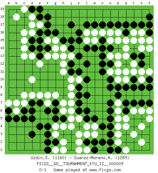 Last move : 0-1 2009 June 16 8:58:24 [Event "FICGS__GO__TOURNAMENT_KYU_II__000009"] [Site "FICGS"] [Date "2009.05.17"] [Round "1"] [Black "Uzdin,Sergey"] [White "Suarez-Moreno,Alejandro"] [Result "0-1"] [Rating 1 "1160"] [Rating 2 "1289"] 1.q16 d17 2.d3 q4 3.c5 c15 4.o3 p3 5.o4 m4 6.q6 s4 7.r5 p5 8.m2 k3 9.q9 q14 10.o17 r16 11.r17 r15 12.s17 r11 13.r10 q11 14.r4 r3 15.s5 s2 16.o5 p6 17.o6 p7 18.o9 p2 19.q7 g3 20.o7 d10 21.j17 c7 22.f17 l16 23.l17 m16 24.m17 n16 25.f3 g4 26.f4 f5 27.g5 e5 28.g6 j4 29.d6 f7 30.f6 e6 31.e7 e8 32.d7 c8 33.o14 o15 34.o12 o11 35.n12 p12 36.n11 o13 37.n13 p13 38.n14 p15 39.o10 g8 40.k16 f13 41.e14 d13 42.e13 e12 43.p8 g13 44.r13 s14 45.e16 d16 46.o2 j7 47.l14 j10 48.l6 h6 49.h5 j5 50.g7 f8 51.e4 h7 52.d5 q5 53.l8 p16 54.p17 q15 55.q17 r6 56.l10 k12 57.j14 g15 58.g16 f15 59.e15 j13 60.h15 b6 61.b5 m3 62.l2 k2 63.r7 s6 64.s7 t5 65.g2 h2 66.f2 h4 67.k13 h14 68.j12 h13 69.k11 h12 70.j11 h11 71.j15 k10 72.l12 c13 73.e18 d18 74.d19 c19 75.e19 b18 76.f16 s10 77.t15 t14 78.s9 s11 79.k8 j8 80.k6 j6 81.m5 l3 82.n17 l1 83.n2 e17 84.f18 q10 85.r9 s16 86.t16 s15 87.s12 r12 88.s13 t17 89.t16 q13 90.t18 p11 91.m1 k1 92.n15 o16 93.a6 a7 94.a5 d8 95.n4 k5 96.l5 l4 97.c6 b7 98.k9 j9 99.k7 g1 100.f1 h1 101.d15 c16 102.p1 q1 103.o1 l15 104.k15 m15 105.m14 p10 106.f14 g14 107.t10 t11 108.t9 p4 109.d14 c14 110.t7 t6 111.p9 t15 112.t17 pass 0-1 Here are the names of the openings (joseki) played in the four corners : Corner q4 : q4 o3 Hoshi (Hwajeom, Seongjeom, Xingwei`) 4-4 Point. The star or hoshi (4-4) point, emphasizing influence at the potential expense of territory. Ikken Kakari (Hankan Keolch'im, Yi Gua`jiao~, 1-Space Low Approach). Black 2 is the standard approach move to the 4-4. Corner q16 : q16 q14 Hoshi (Hwajeom, Seongjeom, Xingwei`) 4-4 Point. The star or hoshi (4-4) point, emphasizing influence at the potential expense of territory. Ikken Takagakari (Hankan Nop'dakeolch'im, Yi Gaojia, 1-Space High Approach). Black typically responds at 6-4 or 3-10. Black 4-10 is played when Black finds play on the right side advantageous. Black 4-8 or 3-8 may be played when Black has support at top. Player White won this Go (weiqi, baduk) game. Follow this game move after move (download)Each step in a ladder is worth 7 points. (Anonymous) If everyone is thinking alike, then somebody isn't thinking. (US General George S. Patton)