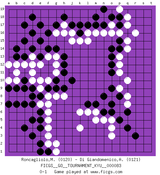 Last move : 0-1 2009 September 5 10:13:20 [Event "FICGS__GO__TOURNAMENT_KYU__000083"] [Site "FICGS"] [Date "2009.05.18"] [Round "1"] [Black "Roncagliolo,Marco"] [White "Di Giandomenico,Alfonso"] [Result "0-1"] [Rating 1 "0120"] [Rating 2 "0121"] 1.c17 p16 2.r3 j16 3.q16 d17 4.d16 e16 5.e17 d10 6.d18 d4 7.e15 k4 8.f16 d13 9.p15 o16 10.o14 o4 11.q4 o3 12.p5 o5 13.o6 n5 14.n6 m5 15.e5 f4 16.e4 f5 17.d5 f3 18.d3 m6 19.m7 l6 20.l7 k6 21.c4 f6 22.e6 e7 23.d7 f8 24.e8 f7 25.d9 e9 26.d8 f10 27.c10 d11 28.d14 c14 29.c13 c12 30.b13 b12 31.b14 a12 32.c15 g16 33.e13 d12 34.g9 g8 35.f9 e10 36.h9 h8 37.g10 g11 38.h11 g12 39.j10 g13 40.f14 e12 41.g14 f13 42.h13 c9 43.b9 c8 44.c7 b8 45.b7 a8 46.a9 b10 47.a7 a10 48.c9 b11 49.h12 q10 50.n8 q8 51.o7 q7 52.p8 p9 53.o9 p11 54.o11 p12 55.o12 p13 56.p14 q14 57.o13 q15 58.p17 o17 59.o18 n18 60.n17 n16 61.m17 m16 62.l17 l16 63.k16 k15 64.k17 q17 65.p18 q18 66.m18 r16 67.n19 p19 68.j17 h17 69.g17 h16 70.h18 j15 71.e2 f2 72.f1 g1 73.e1 g2 74.q6 l15 0-1 Here are the names of the openings (joseki) played in the four corners : Corner d16 : c17 j16 San-San (Sam-Sam, San-San) 3-3 Point. The San-San (3-3) point, emphasizing territory at the expense of influence. Corner q16 : p16 q16 Takamoku (Gomok, Gaomu`) 5-4 Point. The takamoku (high) point (5-4). With its emphasis on influence, the 5-4 point complements the 4-4 (hoshi) point in creating an influence-oriented fuseki. Corner q4 : r3 o4 San-San (Sam-Sam, San-San) 3-3 Point. The San-San (3-3) point, emphasizing territory at the expense of influence. Nikken Takagakari (Dukan Nop'dakeolch'im, E`r Gaogua`jiao~, 2-Space High Approach). Black may continue with 4-5 or 4-6. Black 4-6 works well when Black is in the lower right (so an extension in the middle works both ways). The more conservative 4-5 is makes a slightly tighter shape (better for a fight). Corner d4 : d4 e5 Hoshi (Hwajeom, Seongjeom, Xingwei`) 4-4 Point. The star or hoshi (4-4) point, emphasizing influence at the potential expense of territory. Player White won this Go (weiqi, baduk) game. Follow this game move after move (download)Five groups might live but the six will die. (Anonymous) Thibault, I ask for draw. Game 13876. - Sorry Ilmars, you won. (FICGS chat)