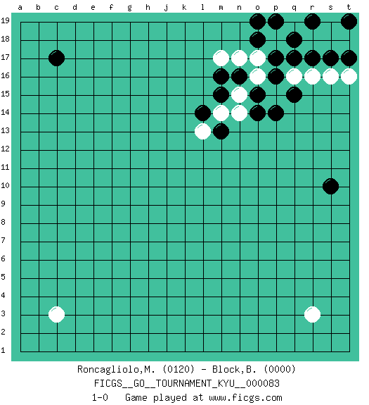 Last move : 1-0 2009 June 8 15:56:11 [Event "FICGS__GO__TOURNAMENT_KYU__000083"] [Site "FICGS"] [Date "2009.05.18"] [Round "1"] [Black "Roncagliolo,Marco"] [White "Block,Benjamin"] [Result "1-0"] [Rating 1 "0120"] [Rating 2 "0000"] 1.r17 c3 2.c17 r3 3.s10 r18 4.q18 s18 5.s17 p18 6.q17 q19 7.p17 p19 8.o18 s19 9.o19 t18 10.t17 t16 11.r19 q19 12.p19 s16 13.r19 r16 14.t19 q16 15.p16 p15 16.p14 o16 17.o15 n15 18.q15 o17 19.n16 n17 20.m16 m17 21.m15 n14 22.o14 m14 23.l14 l13 24.m13 1-0 Here are the names of the openings (joseki) played in the four corners : Corner q16 : r17 r18 San-San (Sam-Sam, San-San) 3-3 Point. The San-San (3-3) point, emphasizing territory at the expense of influence. Player Black won this Go (weiqi, baduk) game. Follow this game move after move (download)Do not fear furikawari. (Anonymous) Gambling : The sure way of getting nothing from something. (Wilson Mizner)