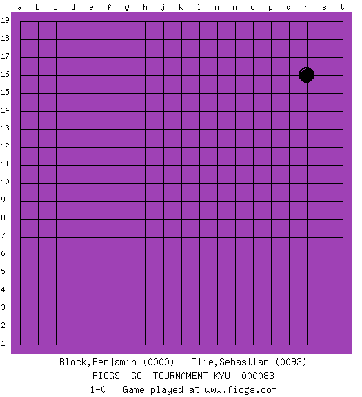 Last move : 1-0 2009 June 17 20:21:17 [Event "FICGS__GO__TOURNAMENT_KYU__000083"] [Site "FICGS"] [Date "2009.05.18"] [Round "1"] [Black "Block,Benjamin"] [White "Ilie,Sebastian"] [Result "1-0"] [Rating 1 "0000"] [Rating 2 "0093"] 1.r16 1-0 This go game has been lost on time (started : 2009.05.18 2:52:9) Here are the names of the openings (joseki) played in the four corners : Player Black won this Go (weiqi, baduk) game. Follow this game move after move (download)Win the stones, lose the game. (Anonymous) I have opinions of my own - strong opinions - but I don't always agree with them. (George Bush)