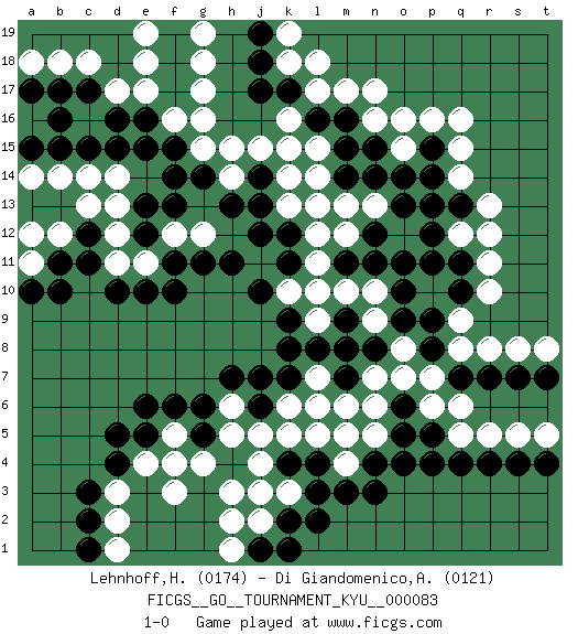 Last move : 1-0 2009 June 23 14:53:38 [Event "FICGS__GO__TOURNAMENT_KYU__000083"] [Site "FICGS"] [Date "2009.05.18"] [Round "1"] [Black "Lehnhoff,Heinz-Georg"] [White "Di Giandomenico,Alfonso"] [Result "1-0"] [Rating 1 "0174"] [Rating 2 "0121"] 1.d16 p16 2.d4 p10 3.e10 m4 4.k4 k16 5.q4 f16 6.e15 q5 7.r4 r5 8.s4 s5 9.t4 t5 10.p5 q6 11.q7 p6 12.p4 p7 13.p8 q8 14.r7 r8 15.s7 s8 16.t7 t8 17.o6 o8 18.p9 o7 19.o9 n6 20.o5 n7 21.m8 n5 22.o4 q9 23.q10 r10 24.q11 r11 25.p11 q12 26.o10 r13 27.p13 q14 28.p14 q15 29.p15 q16 30.p12 o16 31.n15 n16 32.m16 m17 33.m15 l17 34.q13 r12 35.n4 m5 36.n8 l6 37.m7 k5 38.l4 l5 39.m3 j4 40.l3 h5 41.k7 h3 42.j6 k3 43.k2 j3 44.l2 j5 45.g6 f5 46.e6 e4 47.d5 d3 48.e5 f3 49.g5 g4 50.f6 f4 51.c3 d2 52.c2 d1 53.c1 j15 54.j14 l15 55.m14 l14 56.l13 k14 57.j13 h14 58.h13 g15 59.g14 h15 60.f17 g17 61.f15 g16 62.f14 d14 63.d15 c14 64.c15 b14 65.b15 a14 66.a15 d13 67.c12 b12 68.b11 a11 69.b10 d12 70.c11 d11 71.d10 e11 72.f10 c13 73.a10 a12 74.f11 f12 75.f13 g12 76.h11 o15 77.o14 e17 78.f18 g18 79.f19 g19 80.l16 k15 81.k17 k18 82.j17 e18 83.e16 e19 84.e13 d17 85.c17 c18 86.b17 b18 87.a17 a18 88.b16 k13 89.k12 m13 90.n14 l12 91.j12 l11 92.k11 l10 93.k9 l9 94.l8 n9 95.m9 n10 96.n11 m10 97.m11 n13 98.n12 l13 99.o13 k10 100.j10 h6 101.h7 k6 102.j7 j2 103.j1 h1 104.k1 h2 105.n3 n17 106.j18 k19 107.j19 l18 108.g11 l7 109.k8 m12 110.o11 m6 111.e12 pass 112.pass 1-0 Here are the names of the openings (joseki) played in the four corners : Corner q4 : m4 q4 This joseki is unknown. A weak or weird move has probably been played in this corner. Corner d16 : d16 f16 Hoshi (Hwajeom, Seongjeom, Xingwei`) 4-4 Point. The star or hoshi (4-4) point, emphasizing influence at the potential expense of territory. Ikken Takagakari (Hankan Nop'dakeolch'im, Yi Gaojia, 1-Space High Approach). Black typically responds at 6-4 or 3-10. Black 4-10 is played when Black finds play on the right side advantageous. Black 4-8 or 3-8 may be played when Black has support at top. Corner q16 : p16 q11 Takamoku (Gomok, Gaomu`) 5-4 Point. The takamoku (high) point (5-4). With its emphasis on influence, the 5-4 point complements the 4-4 (hoshi) point in creating an influence-oriented fuseki. Corner d4 : d4 j4 Hoshi (Hwajeom, Seongjeom, Xingwei`) 4-4 Point. The star or hoshi (4-4) point, emphasizing influence at the potential expense of territory. Player Black won this Go (weiqi, baduk) game. Follow this game move after move (download)On the third line, four die, six live. (Anonymous) Cactus - It is depressed cucumber. (Ilmars Cirulis)