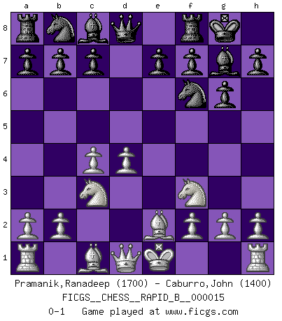 Last move : 0-1 2006 November 5 3:15:26 [Event "FICGS__CHESS__RAPID_B__000015"] [Site "FICGS"] [Date "2006.09.12"] [Round "1"] [White "Pramanik,Ranadeep"] [Black "Caburro,John"] [Result "0-1"] [WhiteElo "1700"] [BlackElo "1400"] 1.e4 d5 2.exd5 Qxd5 3.Nf3 Nf6 4.Be2 g6 5.d4 Bg7 6.c4 Qd8 7.Nc3 O-O 0-1 This chess game has been lost on time (started : 2006.09.12 15:9:17) Scandinavian (centre counter) defense Kingside Castling by player Black (move 7) Player Black won this chess game. Follow this game move after move (download)The passed Pawn is a criminal, who should be kept under lock and key. Mild measures, such as police surveillance, are not sufficient. (Aaron Nimzovich) Rubinstein ist ein Turmendspiel, welches die Götter vor tausenden von Jahren begannen. (Savielly Grigorievitsch Tartakower) Nada excita más a Grandes Maestros aburridos que una novedad teórica. (Dominic Lawson) Le jeu d'échecs est comme rejeté hors du temps. (Antoine de Saint-Exupéry) The right perception of any matter and a misunderstanding of the same matter do not wholly exclude each other. (Kafka's the trial)