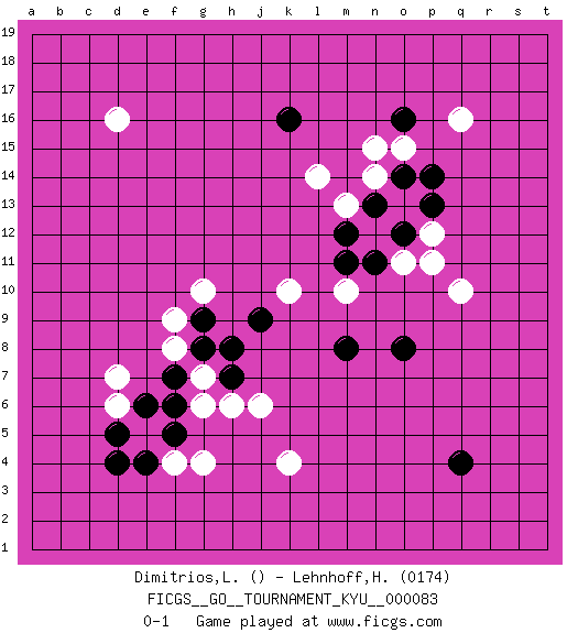 Last move : 0-1 2009 July 24 9:9:55 [Event "FICGS__GO__TOURNAMENT_KYU__000083"] [Site "FICGS"] [Date "2009.05.18"] [Round "1"] [Black "Dimitrios,Lim"] [White "Lehnhoff,Heinz-Georg"] [Result "0-1"] [Rating 2 "0174"] 1.f5 q16 2.q4 d16 3.d4 k4 4.m8 j6 5.h8 g6 6.f7 d7 7.f6 f9 8.g8 f8 9.k16 q10 10.o8 g4 11.j9 k10 12.o12 p12 13.p14 l14 14.p13 p11 15.n13 n14 16.o14 n15 17.o16 o15 18.n11 o11 19.m12 m13 20.m11 m10 21.h7 h6 22.e6 g7 23.d5 d6 24.e4 f4 25.g9 g10 0-1 Here are the names of the openings (joseki) played in the four corners : Corner q16 : q16 o12 Hoshi (Hwajeom, Seongjeom, Xingwei`) 4-4 Point. The star or hoshi (4-4) point, emphasizing influence at the potential expense of territory. Player White won this Go (weiqi, baduk) game. Follow this game move after move (download)Go is to western chess what philosophy is to double entry accounting. (from Shibumi, by Trevanian) I think your argument is specious - I think your tie is ugly. (Gregory House to Dr. Foreman, House M.D.)