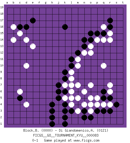 Last move : 0-1 2009 September 20 17:56:39 [Event "FICGS__GO__TOURNAMENT_KYU__000083"] [Site "FICGS"] [Date "2009.05.18"] [Round "1"] [Black "Block,Benjamin"] [White "Di Giandomenico,Alfonso"] [Result "0-1"] [Rating 1 "0000"] [Rating 2 "0121"] 1.r16 p4 2.c16 j4 3.c5 q10 4.r3 d4 5.k16 d10 6.k3 j3 7.k4 j2 8.k2 j1 9.k1 d14 10.j5 c15 11.h4 b16 12.h3 b14 13.h2 c6 14.h1 r15 15.d16 e13 16.e17 q14 17.q15 q16 18.p15 p14 19.o15 r14 20.r17 r4 21.q3 q4 22.p3 o12 23.o14 o13 24.n14 o7 25.o4 o5 26.n5 p5 27.n13 n12 28.m12 m11 29.l11 m10 30.l10 l9 31.k9 l8 32.k8 k7 33.j7 l6 34.k6 l7 35.l5 n6 36.m6 m7 37.s4 m5 38.m4 n4 39.n3 o3 40.o2 o4 41.r5 m3 42.q5 l4 43.l3 k5 44.j6 l5 45.n2 r6 46.q6 r7 0-1 Here are the names of the openings (joseki) played in the four corners : Corner d4 : j4 c5 This joseki is unknown. A weak or weird move has probably been played in this corner. Corner q4 : p4 r3 Takamoku (Gomok, Gaomu`) 5-4 Point. The takamoku (high) point (5-4). With its emphasis on influence, the 5-4 point complements the 4-4 (hoshi) point in creating an influence-oriented fuseki. San-san. Black plays the 3-3 when White has a stone at top such as marked. Corner d16 : c16 d14 Komoku (Somok, Xiao~mu`) 3-4 Point. The komoku (3-4) point is the traditional corner enclosure move.. Corner q16 : r16 r15 Komoku (Somok, Xiao~mu`) 3-4 Point. The komoku (3-4) point is the traditional corner enclosure move.. Player White won this Go (weiqi, baduk) game. Follow this game move after move (download)More haste less speed. (John Fairbairn) Go and wake up your luck. (Persian saying)