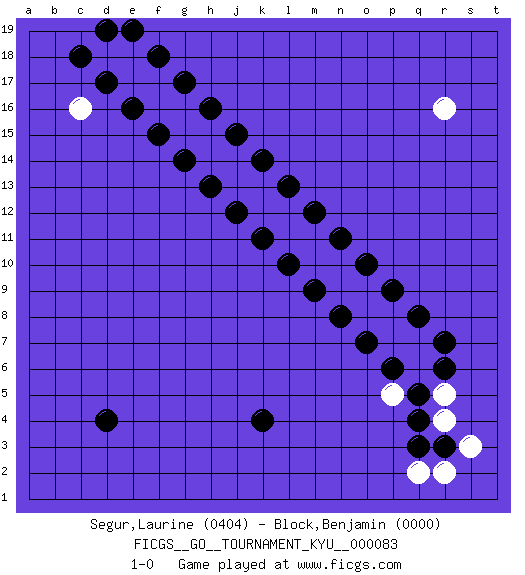 Last move : 1-0 2009 June 19 7:24:22 [Event "FICGS__GO__TOURNAMENT_KYU__000083"] [Site "FICGS"] [Date "2009.05.18"] [Round "1"] [Black "Segur,Laurine"] [White "Block,Benjamin"] [Result "1-0"] [Rating 1 "0404"] [Rating 2 "0000"] 1.d4 r16 2.q4 c16 3.k4 r4 4.q3 r5 5.r3 s3 6.r7 r2 7.q5 q2 8.r6 q6 9.p6 q7 10.q8 p7 11.o7 p8 12.p9 o8 13.n8 o9 14.o10 n9 15.m9 n10 16.n11 m10 17.l10 m11 18.m12 l11 19.k11 l12 20.l13 k12 21.j12 k13 22.k14 j13 23.h13 j14 24.j15 h14 25.g14 h15 26.h16 g15 27.f15 g16 28.g17 f16 29.e16 f17 30.f18 e17 31.d17 e18 32.e19 d18 33.c18 p5 34.d19 1-0 Here are the names of the openings (joseki) played in the four corners : Corner q4 : q4 r4 Hoshi (Hwajeom, Seongjeom, Xingwei`) 4-4 Point. The star or hoshi (4-4) point, emphasizing influence at the potential expense of territory. Corner q16 : r16 n11 Komoku (Somok, Xiao~mu`) 3-4 Point. The komoku (3-4) point is the traditional corner enclosure move.. Corner d16 : c16 j12 Komoku (Somok, Xiao~mu`) 3-4 Point. The komoku (3-4) point is the traditional corner enclosure move.. Corner d4 : d4 1-0 Hoshi (Hwajeom, Seongjeom, Xingwei`) 4-4 Point. The star or hoshi (4-4) point, emphasizing influence at the potential expense of territory. Player Black won this Go (weiqi, baduk) game. Follow this game move after move (download)Use a wall to attack, not to make territory. (Anonymous) When you stop learning you start dying. (M. Scott Adams)