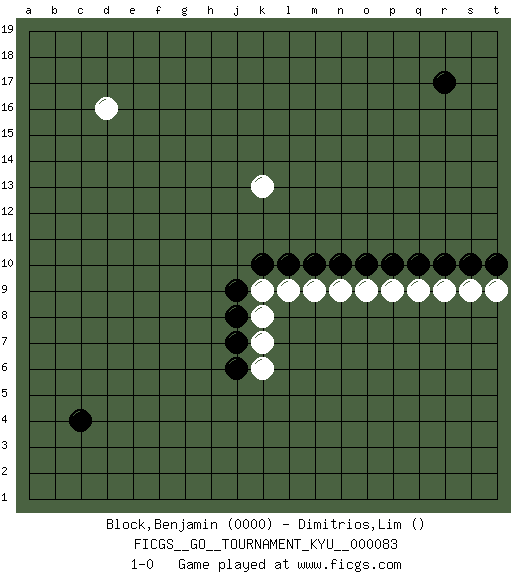 Last move : 1-0 2009 August 2 0:7:58 [Event "FICGS__GO__TOURNAMENT_KYU__000083"] [Site "FICGS"] [Date "2009.05.18"] [Round "1"] [Black "Block,Benjamin"] [White "Dimitrios,Lim"] [Result "1-0"] [Rating 1 "0000"] 1.k10 d16 2.c4 k13 3.r17 k9 4.j9 l9 5.l10 m9 6.m10 n9 7.n10 o9 8.o10 p9 9.p10 q9 10.q10 r9 11.r10 s9 12.s10 t9 13.t10 k8 14.j8 k7 15.j7 k6 16.j6 1-0 This go game has been lost on time (started : 2009.05.18 2:52:9) Here are the names of the openings (joseki) played in the four corners : Player Black won this Go (weiqi, baduk) game. Follow this game move after move (download)There is no territory in the centre. (Anonymous) Computer Science is no more about computers than astronomy is about telescopes. (Edsger W. Dijkstra)