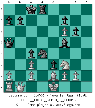 Last move : 0-1 2006 October 15 22:39:45 [Event "FICGS__CHESS__RAPID_B__000015"] [Site "FICGS"] [Date "2006.09.12"] [Round "1"] [White "Caburro,John"] [Black "Yuvarlak,Ugur"] [Result "0-1"] [WhiteElo "1400"] [BlackElo "1578"] 1.d4 Nf6 2.e4 Nxe4 3.Nc3 Nxc3 4.bxc3 d5 5.Bd3 g6 6.Nf3 Bg7 7.h4 c5 8.h5 c4 9.Be2 Bf5 10.hxg6 hxg6 11.Rxh8+ Bxh8 12.Bf4 Nc6 13.Kd2 Qa5 14.Qh1 O-O-O 15.Be3 Bf6 16.Qb1 e5 17.dxe5 d4 18.exf6 dxe3+ 19.Ke1 Nd4 0-1 Queen's pawn game Queenside Castling by player Black (move 14) Player Black won this chess game. Follow this game move after move (download)Every Chess master was once a beginner. (Chernev) Kostenjuk hat keinen Sexappeal. (Loek van Wely) Debió haber existido una vez en que los hombres eran semidióses, de otra manera no hubiesen podido inventar el Ajedrez. (Gustav Schenk) La conception d'un plan est le processus par lequel un joueur exploite les avantages de sa position tout en s'efforçant d'en réduire au minimum les inconvénients. Afin de garantir le succès, un plan doit toujours se fonder sur un diagnostic objectif des particularités d'une position. La conception d'un plan est d'autant plus difficile que la position est équilibrée, et grandement facilitée lorsqu'il n'existe qu'un seul plan susceptible de répondre aux exigences de la position. (Harry Golombek) I have opinions of my own - strong opinions - but I don't always agree with them. (George Bush)