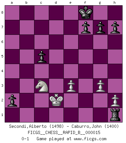 Last move : 0-1 2006 November 28 12:28:15 [Event "FICGS__CHESS__RAPID_B__000015"] [Site "FICGS"] [Date "2006.09.12"] [Round "1"] [White "Secondi,Alberto"] [Black "Caburro,John"] [Result "0-1"] [WhiteElo "1498"] [BlackElo "1400"] 1.d4 e5 2.dxe5 Nc6 3.Nf3 Qe7 4.Bf4 Qb4+ 5.Bd2 Qxb2 6.Nc3 Bb4 7.Nd5 Bxd2+ 8.Nxd2 Qxe5 9.Nf3 Qd6 10.Nc3 Qc5 11.Qd2 Nf6 12.g3 d6 13.Bg2 O-O 14.O-O Re8 15.Rfe1 Bf5 16.Na4 Qxc2 17.Qxc2 Bxc2 18.Nc3 Re7 19.Rac1 Bf5 20.Nd2 Rae8 21.e3 Nb4 22.Bxb7 Nd3 23.Bc6 Rd8 24.Nc4 Nxe1 25.Rxe1 d5 26.Na5 d4 27.Nb5 dxe3 28.Rxe3 Bh3 29.Nc3 Rxe3 30.fxe3 Rd3 31.Bg2 Bxg2 32.Kxg2 Rxc3 33.Kf3 Ra3 34.Nc6 Rxa2 35.Ne7+ Kf8 36.Nc6 a5 37.Nd4 c5 38.Nb5 a4 39.Nc3 Ra1 40.Ke2 a3 41.Kd2 Ne4+ 42.Nxe4 a2 43.Nc3 Rh1 0-1 Queen's pawn : Charlick (Englund) gambit Kingside Castling by player Black (move 13) Kingside Castling by player White (move 14) Player Black won this chess game. Follow this game move after move (download)It's just you and your opponent at the board and you're trying to prove something. (Bobby Fischer) Ich liebe den Moment, wenn ich das Ego meines Gegenüber breche. (Robert James Fischer) Creo que una cierta cantidad de temperamento es esperada de los genios del Ajedrez. (Ron Gross) Que feriez-vous si vous étiez en train de jouer aux échecs et que la fin du monde arrive ? Je continuerais à jouer. (Saint Borromée) Do not put your faith in what statistics say until you have carefully considered what they do not say. (William W. Watt)