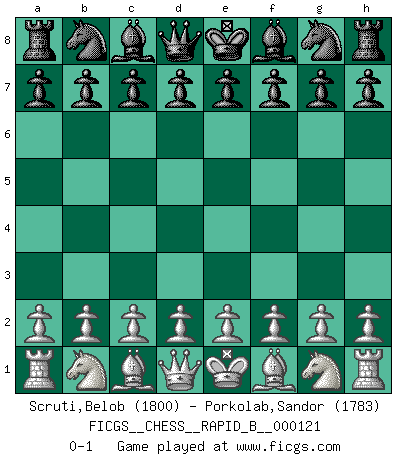 Last move : 0-1 2009 June 18 20:27:23 [Event "FICGS__CHESS__RAPID_B__000121"] [Site "FICGS"] [Date "2009.05.19"] [Round "1"] [White "Scruti,Belob"] [Black "Porkolab,Sandor"] [Result "0-1"] [WhiteElo "1800"] [BlackElo "1783"] 0-1 This chess game has been lost on time (started : 2009.05.19 11:5:1) Player Black won this chess game. Follow this game move after move (download)There are two classes of men; those who are content to yield to circumstances and who play whist; those who aim to control circumstances, and who play Chess. (Mortimer Collins) Fischer machte Schach einfach zu einer aufregenden Sache, wann immer er sich ans Brett setzte. (Raymond Keene) El Ajedrez por encima de todo... ¡es una pelea!. (Emanuel Lasker) Ce n'est pas pour s'amuser qu'il joue aux échecs : il célèbre un culte. (Vladimir Nabokov) It is not enough to be a good player... you must also play well. (Siegbert Tarrasch)