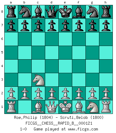 Last move : 1-0 2009 June 18 20:27:23 [Event "FICGS__CHESS__RAPID_B__000121"] [Site "FICGS"] [Date "2009.05.19"] [Round "1"] [White "Roe,Philip"] [Black "Scruti,Belob"] [Result "1-0"] [WhiteElo "1804"] [BlackElo "1800"] 1.Nc3 1-0 This chess game has been lost on time (started : 2009.05.19 11:5:1) Dunst (Sleipner, Heinrichsen) Opening Player White won this chess game. Follow this game move after move (download)Though most people love to look at the games of the great attacking masters, some of the most successful players in history have been the quiet positional players. They slowly grind you down by taking away your space, tying up your pieces, and leaving you with virtually nothing to do ! (Yasser Seirawan) Nicht daß Diemer aus Opportunismus Mitglied der NSDAP geworden wäre. Er war ein Fanatiker, in allem, was er tat. (Hans Ree) El Ajedrez es en su esencia, un juego. En su forma, un arte. Y en su ejecución, una ciencia. (Baron Tassilo) Comme les marins qui ont mille raisons différentes d'aller en mer, les joueurs d'échecs en ont tout autant avant de s'installer devant une table et jouer... (Vincent Bertignac, philosophe) A woman without a man is like a fish without a bicycle. (Gloria Steinem)