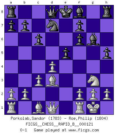 Last move : 0-1 2009 August 12 1:3:12 [Event "FICGS__CHESS__RAPID_B__000121"] [Site "FICGS"] [Date "2009.05.19"] [Round "1"] [White "Porkolab,Sandor"] [Black "Roe,Philip"] [Result "0-1"] [WhiteElo "1783"] [BlackElo "1804"] 1.e4 c6 2.d4 d5 3.Nc3 dxe4 4.Nxe4 Nf6 5.Nxf6+ gxf6 6.c3 Bf5 7.Bd3 Bg6 8.Ne2 Nd7 9.O-O e5 10.Ng3 h5 0-1 This chess game has been lost on time (started : 2009.05.19 11:5:1) Caro-Kann : Bronstein-Larsen variation Kingside Castling by player White (move 9) Player Black won this chess game. Follow this game move after move (download)The older I grow, the more I value Pawns. (Keres) Die jungen Leute sollen verstehen, dass sie noch etwas von mir lernen können und müssen. (Viktor Kortschnoi) El Ajedrez demanda una total concentración. (Bobby Fischer) Les pièces de l'échiquier étaient impitoyables. Elles le retenaient, elles l'absorbaient. Il y avait de l'horreur en cela, mais aussi une harmonie unique. Car, qu'y a-t-il dans le monde, à part les échecs ? (V. Nabokov) Life is the sum of all your choices. (Albert Camus)