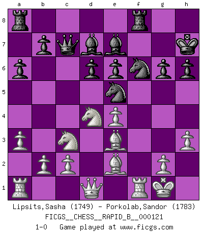 Last move : 1-0 2009 July 27 11:44:32 [Event "FICGS__CHESS__RAPID_B__000121"] [Site "FICGS"] [Date "2009.05.19"] [Round "1"] [White "Lipsits,Sasha"] [Black "Porkolab,Sandor"] [Result "1-0"] [WhiteElo "1749"] [BlackElo "1783"] 1.e4 c5 2.Nf3 d6 3.d4 cxd4 4.Nxd4 Nf6 5.Nc3 a6 6.Bg5 e6 7.f4 h6 8.Bh4 Qb6 9.a3 Bd7 10.Bf2 Qc7 11.Be2 Nc6 12.f5 Ne5 13.O-O Be7 14.fxe6 fxe6 15.Bh5+ g6 16.Be2 O-O 17.Be3 Kh7 18.h3 1-0 This chess game has been lost on time (started : 2009.05.19 11:5:1) Sicilian : Najdorf, 7.f4 Kingside Castling by player White (move 13) Kingside Castling by player Black (move 16) Player White won this chess game. Follow this game move after move (download)I played Chess with him and would have beaten him sometimes only he always took back his last move, and ran the game out differently. (Mark Twain) Wie bekannt hörte Morphy 1859 auf, Schach zu spielen. Seine Enttäuschung galt nicht so sehr dem Schach, wie den Schachspielern. (Robert James Fischer) Hoy en día, si tu no eres un Gran Maestro a los 14 años, es mejor que lo olvides. (Anand Viswanathan) La conception d'un plan est le processus par lequel un joueur exploite les avantages de sa position tout en s'efforçant d'en réduire au minimum les inconvénients. Afin de garantir le succès, un plan doit toujours se fonder sur un diagnostic objectif des particularités d'une position. La conception d'un plan est d'autant plus difficile que la position est équilibrée, et grandement facilitée lorsqu'il n'existe qu'un seul plan susceptible de répondre aux exigences de la position. (Harry Golombek) Humor is by far the most significant activity of the human brain. (Edward De Bono)
