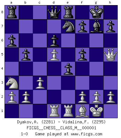 Last move : 1-0 2006 August 2 3:25:5 [Event "FICGS__CHESS__CLASS_M__000001"] [Site "FICGS"] [Date "2006.04.08"] [Round "1"] [White "Dyakov,Alexander"] [Black "Vidalina,Franjo"] [Result "1-0"] [WhiteElo "2281"] [BlackElo "2295"] 1.e4 c5 2.Nf3 Nc6 3.d4 cxd4 4.Nxd4 Nf6 5.Nc3 e5 6.Ndb5 d6 7.Bg5 a6 8.Na3 b5 9.Bxf6 gxf6 10.Nd5 f5 11.Bd3 Be6 12.O-O Bxd5 13.exd5 Ne7 14.Re1 Bg7 15.c3 O-O 16.Qh5 e4 17.Bf1 Re8 18.Rad1 1-0 This chess game has been lost on time (started : 2006.04.08 18:11:42) Sicilian : Pelikan (Lasker/Sveshnikov) variation Kingside Castling by player White (move 12) Kingside Castling by player Black (move 15) Player White won this chess game. Follow this game move after move (download)The battle for the ultimate truth will never be won. And that's why Chess is so fascinating. (Hans Kmoch) Um dein Spiel zu verbessern musst du zuallererst das Endspiel studieren, denn diese kann unabhängig studiert werden. Die Eröffnung und das Mittelspiel müssen immer in Bezug gesetzt werden zum Endspiel. (José Raúl Capablanca) El Ajedrez, como la música, como el amor, tiene el poder de hacer feliz a la gente. (Siegbert Tarrasch) Si rien de grave n'est détecté lors de l'analyse d'une position, on joue alors le coup. Seconde règle de Blumenfeld. However beautiful the strategy, you should occasionally look at the results. (Winston Churchill)