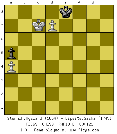 Last move : 1-0 2009 July 25 4:29:7 [Event "FICGS__CHESS__RAPID_B__000121"] [Site "FICGS"] [Date "2009.05.19"] [Round "1"] [White "Sternik,Ryszard"] [Black "Lipsits,Sasha"] [Result "1-0"] [WhiteElo "1864"] [BlackElo "1749"] 1.e4 e6 2.Qe2 c5 3.Nf3 Nc6 4.g3 g6 5.Bg2 Bg7 6.O-O Nge7 7.c3 d5 8.d3 b6 9.e5 h6 10.Re1 Ba6 11.Na3 g5 12.h3 O-O 13.Qd1 Rc8 14.d4 cxd4 15.cxd4 Qd7 16.Nc2 Rfe8 17.b3 Bb5 18.a4 Ba6 19.Ba3 Nf5 20.Qd2 Na5 21.Rab1 Bb7 22.Qd3 Ba6 23.Qxa6 Rxc2 24.Qd3 Rec8 25.Bb4 Ne7 26.Bd2 Ra2 27.Rbc1 Rb2 28.Rxc8+ Qxc8 29.Rc1 Qb7 30.Rc3 Nac6 31.Bc1 Nb4 32.Qb5 Rc2 33.Rxc2 Nxc2 34.Qe2 Qc7 35.Bb2 a5 36.Bf1 Nb4 37.Ne1 Nf5 38.Kh2 Bf8 39.Kg2 Kg7 40.Kg1 Qc8 41.Qd2 Na2 42.Nd3 Bb4 43.Nxb4 Nxb4 44.Bd3 Nxd3 45.Qxd3 Qf8 46.Qc3 Qb4 47.Qxb4 axb4 48.Kf1 Kg6 49.Ke2 Ne7 50.Kd3 Nc6 51.Bc1 Na5 52.Kc2 Nc6 53.Be3 Kf5 54.Kd3 Na5 55.g4+ Kg6 56.Bd2 Nc6 57.Bc1 Na5 58.Bd2 Nxb3 59.Bxb4 Na5 60.Bxa5 bxa5 61.Ke3 Kh7 62.f4 Kg6 63.Kf3 f6 64.exf6 Kxf6 65.Kg3 Ke7 66.h4 Kf6 67.fxg5+ hxg5 68.hxg5+ Kxg5 69.Kf3 Kg6 70.Kf4 Kf6 71.g5+ Kg6 72.Ke5 Kf7 73.Kd6 Kg6 74.Kxe6 Kxg5 75.Kxd5 Kf6 76.Kd6 Kf7 77.d5 Ke8 78.Kc7 Ke7 79.d6+ Ke8 80.d7+ 1-0 French : Chigorin variation Kingside Castling by player White (move 6) Kingside Castling by player Black (move 12) 10 pieces endgame at move 67 : White KPPPP , Black KPPPP WHITE : King + 4 Pawns BLACK : King + 4 Pawns 9 pieces endgame at move 68 : White KPPPP , Black KPPP WHITE : King + 4 Pawns BLACK : King + 3 Pawns 8 pieces endgame at move 68 : White KPPP , Black KPPP WHITE : King + 3 Pawns BLACK : King + 3 Pawns 7 pieces endgame at move 74 : White KPPP , Black KPP WHITE : King + 3 Pawns BLACK : King + 2 Pawns 6 pieces endgame at move 74 : White KPP , Black KPP WHITE : King + 2 Pawns BLACK : King + 2 Pawns 5 pieces endgame at move 75 : White KPP , Black KP WHITE : King + 2 Pawns BLACK : King + 1 Pawn Player White won this chess game. Follow this game move after move (download)In Fischer's hands, a slight theoretical advantage is as good a being a Queen ahead. (Isaac Kashdan) Die Arbeit ist etwas Unnatürliches. Die Faulheit allein ist göttlich. (Anatole France) Los Peones son nacidos libres, y aún así, se encuentran por doquier encadenados. (Rick Kennedy) Botvinnik disait en comparant les échecs à la musique: Il existe une science dont le but est l'étude de l'acoustique et des sons. Mais il y a aussi un art qui se sert de l'océan des sons : c'est la musique. De toute évidence, il en est de même pour la pensée. La logique est l'étude des lois de la réflexion et les échecs reflètent, en tant qu'art, le côté logique de la réflexion, sous la forme d'images artistiques... Extrait de Fischer - Spassky, Reykjavik 1972 par Alexander & F. Wyndham (Ed. Solar), p 37. There are three kinds of lies: lies, damned lies and statistics. (Mark Twain)