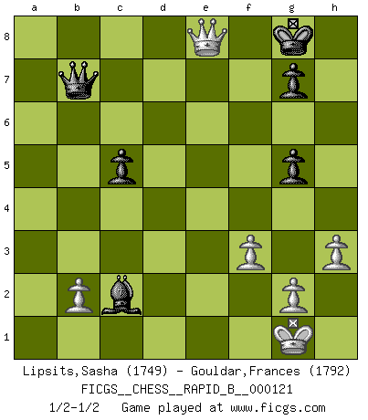 Last move : 1/2-1/2 2009 July 25 4:29:28 [Event "FICGS__CHESS__RAPID_B__000121"] [Site "FICGS"] [Date "2009.05.19"] [Round "1"] [White "Lipsits,Sasha"] [Black "Gouldar,Frances"] [Result "1/2-1/2"] [WhiteElo "1749"] [BlackElo "1792"] 1.e4 e5 2.Nf3 Nc6 3.Bb5 d6 4.O-O Bd7 5.d4 exd4 6.Bxc6 Bxc6 7.Nxd4 Bd7 8.Qe2 Be7 9.e5 d5 10.Rd1 Qc8 11.Nc3 c6 12.Qd3 Bg4 13.Re1 Bc5 14.h3 Be6 15.Nf3 Bf5 16.Qd1 Ne7 17.Na4 Bb4 18.Bd2 Bxd2 19.Qxd2 O-O 20.Nd4 Bg6 21.Nc5 Nf5 22.Nf3 b6 23.Nd3 Ne7 24.a4 Re8 25.a5 c5 26.Nf4 Be4 27.Ng5 Bf5 28.Nxd5 h6 29.axb6 Qd8 30.e6 hxg5 31.b7 Rb8 32.Nxe7+ Qxe7 33.exf7+ Qxf7 34.Rxe8+ Qxe8 35.Rxa7 Be4 36.Qe3 Qc6 37.f3 Bxc2 38.Qe5 Rxb7 39.Rxb7 Qxb7 40.Qe8+ Kh7 41.Qh5+ Kg8 42.Qe8+ Kh7 43.Qh5+ Kg8 44.Qe8+ 1/2-1/2 Ruy Lopez : Old Steinitz defense Kingside Castling by player White (move 4) Kingside Castling by player Black (move 19) This chess game ended in a draw. Follow this game move after move (download)No price is too great for the scalp of the enemy King. (Koblentz) Gewinnen beim Schach fördert das Selbstvertrauen. Beim Sex spüre ich sowas nicht... (Garry Kasparov) La caracteristica mas importante en la posición del Ajedrez es la actividad de las piezas. Esto es absolutamente fundamental en todas las fases del juego: Apertura, Juego Medio y especialmente Finales. La limitación primordial en la actividad de una pieza, es la estructuración de los Peones. (Michael Stean) On croit qu'il y a plus de mauvais joueurs que de bons joueurs, c'est faux : Il y a autant de joueurs qui gagnent que de joueurs qui perdent. (Philippe Geluck) If you know the enemy and know yourself you need not fear the results of a hundred battles. (Sun Tzu)