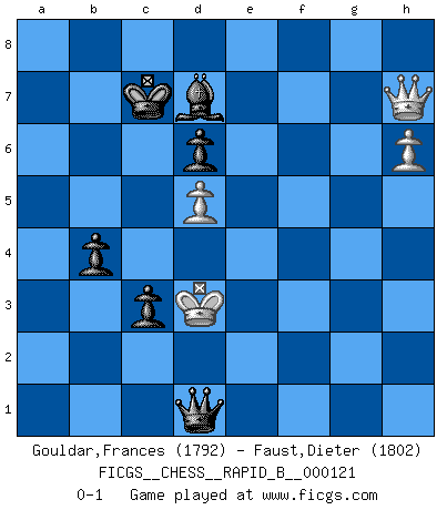 Last move : 0-1 2009 September 6 13:41:5 [Event "FICGS__CHESS__RAPID_B__000121"] [Site "FICGS"] [Date "2009.05.19"] [Round "1"] [White "Gouldar,Frances"] [Black "Faust,Dieter"] [Result "0-1"] [WhiteElo "1792"] [BlackElo "1802"] 1.d4 Nf6 2.c4 c5 3.d5 e6 4.Nc3 exd5 5.Nxd5 Nxd5 6.cxd5 d6 7.e4 g6 8.Bb5+ Nd7 9.Bd2 Bg7 10.Qc2 Qb6 11.Bc3 Bxc3+ 12.Qxc3 O-O 13.Bd3 f5 14.exf5 Ne5 15.Be2 Bxf5 16.Nf3 Nxf3+ 17.Bxf3 Qa6 18.Kd2 b5 19.Rhe1 b4 20.Qb3 Qb7 21.a3 a5 22.axb4 axb4 23.Rxa8 Qxa8 24.Re7 Qa1 25.Bd1 Qb1 26.f3 Qa1 27.h4 Kh8 28.Rc7 Re8 29.g4 Bb1 30.h5 gxh5 31.gxh5 Bf5 32.Rf7 Re5 33.h6 Qa8 34.Kc1 Kg8 35.Rg7+ Kf8 36.f4 Qa1+ 37.Kd2 c4 38.Rg8+ Kxg8 39.Qg3+ Kf8 40.Qg7+ Ke8 41.Bh5+ Kd8 42.fxe5 Qxb2+ 43.Ke3 Qxe5+ 44.Kf2 Qh2+ 45.Ke3 Qxh5 46.Qf6+ Kc7 47.Qe7+ Bd7 48.Qxh7 c3 49.Kd3 Qd1+ 0-1 Benoni defense Kingside Castling by player Black (move 12) 10 pieces endgame at move 48 : White KQPP , Black KQBPPP WHITE : King + 1 Queen 2 Pawns BLACK : King + 1 Queen 1 Bishop 3 Pawns Player Black won this chess game. Follow this game move after move (download)By this measure (on the gap between Fischer & his contemporaries), I consider him the greatest world champion. (Garry Kasparov) Ohne Leiden bildet sich kein Charakter. (Ernst Freiherr von Feuchtersleben) Todavía soy una víctima del Ajedrez. Tiene toda la belleza del arte y mucho mas. No puede ser comercializado. El Ajedrez es mas puro que el arte en su posición social. (Marcel Duchamp) Je crois qu'il existe des manières très spécifiques de jouer efficacement contre une machine. Evidemment, nous n'avons aucune chance en technique pure, parce que l'ordinateur calcule de manière parfaite. Mais lorsque nous faisons appel à notre cerveau, en utilisant l'intuition et la compréhension, alors nous restons beaucoup plus forts. (Anatoli Karpov) Children in the dark cause accidents, accidents in the dark cause children. (Unknown)