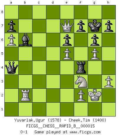 Last move : 0-1 2007 January 30 9:19:55 [Event "FICGS__CHESS__RAPID_B__000015"] [Site "FICGS"] [Date "2006.09.12"] [Round "1"] [White "Yuvarlak,Ugur"] [Black "Cheek,Tim"] [Result "0-1"] [WhiteElo "1578"] [BlackElo "1400"] 1.d4 d5 2.Nf3 Nf6 3.c4 c6 4.Nc3 dxc4 5.a4 Bf5 6.e3 e6 7.Bxc4 Bb4 8.O-O O-O 9.Qe2 c5 10.Rd1 Nc6 11.h3 cxd4 12.Nb5 Rc8 13.Nbxd4 Nxd4 14.Rxd4 Qe7 15.Bd2 Bc5 16.Rh4 Ne4 17.Bc3 Nxc3 18.bxc3 Rfd8 19.e4 Bg6 20.e5 Qc7 21.a5 Be7 22.Rf4 Bh5 23.g4 Bg6 24.a6 b6 25.Rd1 Rxd1+ 26.Qxd1 Qc6 27.Qe2 b5 28.Bxb5 Qxc3 29.Kg2 Bc5 30.Rc4 Qa5 31.Rc1 Qa3 32.Rd1 Bb6 33.Bd3 Bxd3 34.Rxd3 Qa4 35.g5 Kf8 36.Rd2 Rc3 37.Rb2 g6 38.Qd2 Rc6 39.Qd7 Rc4 40.Qd6+ Kg7 41.Qe7 Rf4 0-1 Queen's pawn game Kingside Castling by player White (move 8) Kingside Castling by player Black (move 8) Player Black won this chess game. Follow this game move after move (download)Chess, like any creative activity, can exist only through the combined efforts of those who have creative talent, and those who have the ability to organize their creative work. (Mikhail Botvinnik) Ein Buch ist ein Spiegel; wenn ein Affe hineinsieht, so kann kein Apostel heraus gucken. (Georg Christoph Lichtenberg) Después de la respuesta de las negras a 1.e4 con 1..e5, se quedan siempre tratando de entrar dentro del juego. (Howard Staunton) Karpov est une pièce de musée. (Garry Kasparov) A good player is always lucky. (Capablanca)