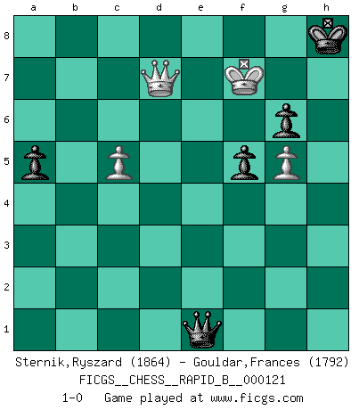 Last move : 1-0 2009 July 17 18:45:44 [Event "FICGS__CHESS__RAPID_B__000121"] [Site "FICGS"] [Date "2009.05.19"] [Round "1"] [White "Sternik,Ryszard"] [Black "Gouldar,Frances"] [Result "1-0"] [WhiteElo "1864"] [BlackElo "1792"] 1.e4 c5 2.Nf3 d6 3.d4 cxd4 4.Nxd4 Nf6 5.Nc3 g6 6.Be2 Bg7 7.O-O O-O 8.Kh1 Bd7 9.Be3 Nc6 10.f4 Nxd4 11.Bxd4 a6 12.e5 dxe5 13.fxe5 Ne8 14.Qe1 Bc6 15.Rd1 Qc7 16.Bf3 Bxf3 17.Rxf3 Rd8 18.Rh3 h6 19.R1d3 b5 20.a3 Qc4 21.Be3 Rxd3 22.cxd3 Qb3 23.Bc5 Qe6 24.d4 Nc7 25.Rf3 Rd8 26.Qe4 Nd5 27.Kg1 Nxc3 28.bxc3 Kh7 29.Qf4 f6 30.exf6 exf6 31.Re3 Qa2 32.h3 Rd7 33.Qf3 Rc7 34.Qe4 a5 35.Qe6 Qxe6 36.Rxe6 Rb7 37.g4 h5 38.Kf2 hxg4 39.hxg4 f5 40.g5 Rb8 41.Ke3 Bf8 42.Kd3 Bxc5 43.dxc5 Kg7 44.Kd4 Rd8+ 45.Ke5 Rd3 46.c4 Re3+ 47.Kd6 Rxe6+ 48.Kxe6 b4 49.c6 bxa3 50.c7 a2 51.c8Q a1Q 52.Qd7+ Kh8 53.c5 Qe1+ 54.Kf7 1-0 Sicilian : Dragon variation Kingside Castling by player White (move 7) Kingside Castling by player Black (move 7) 10 pieces endgame at move 48 : White KPPPP , Black KPPPP WHITE : King + 4 Pawns BLACK : King + 4 Pawns 9 pieces endgame at move 49 : White KPPP , Black KPPPP WHITE : King + 3 Pawns BLACK : King + 4 Pawns Promotion Queen by player White (move 51) Promotion Queen by player Black (move 51) Player White won this chess game. Follow this game move after move (download)The defensive power of a pinned piece is only imaginary. (Aaron Nimzovich) Ich bewundere Kasparows phantasievolle Angriffssiege aus den Achtzigern und Neunzigern, aber wenn man sie mit dem Computer überprüft, nimmt der Computer in jeder zweiten Partie die Opfer an, verteidigt sich und gewinnt. (Vladimir Kramnik) Los problemas de Ajedrez exigen del compositor las mismas virtudes que caracterizan todo el arte de valor: originalidad, invención, concisión, armonía, complejidad e insinceridad explendida. (Vladimir Nabokov) Je ne suis pas le dernier à jouer lâchement des coups douteux pendant le zeïtnot de l'adversaire pour l'achever: en effet les coups qui font le plus peur sont ceux que l'on ne comprend pas. Je me fais souvent peur quand je joue. (Un professeur anonyme) Winning isn't everything... but losing is nothing. (Mednis)