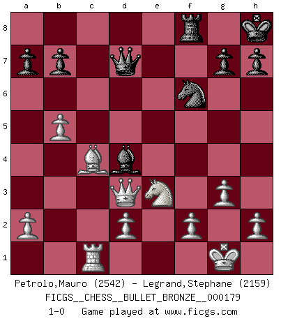 Last move : 1-0 2010 March 31 19:10:44 [Event "FICGS__CHESS__BULLET_BRONZE__000179"] [Site "FICGS"] [Date "2010.03.31"] [Round "1"] [White "Petrolo,Mauro"] [Black "Legrand,Stephane"] [Result "1-0"] [WhiteElo "2542"] [BlackElo "2159"] 1.e4 e5 2.Nf3 Nc6 3.Bb5 f5 4.Nc3 Nf6 5.exf5 Nd4 6.Nxe5 c6 7.Bd3 Bd6 8.Ng4 O-O 9.Ne3 Qc7 10.Ne2 Nxe2 11.Qxe2 Be5 12.g3 d5 13.O-O Bd7 14.c3 Rae8 15.b3 d4 16.cxd4 Bxd4 17.Ba3 c5 18.Rab1 Kh8 19.b4 c4 20.Bxc4 Bxf5 21.Rbc1 Bh3 22.b5 Bxf1 23.Qxf1 Qd7 24.Bxf8 Rxf8 25.Qd3 1-0 Ruy Lopez : Schliemann defense, Berger variation Kingside Castling by player Black (move 8) Kingside Castling by player White (move 13) Player White won this chess game. Follow this game move after move (download)The isolated Pawn casts gloom over the entire chessboard. (Aaron Nimzovich) Der Verteidiger gebe der Gewalt nach, aber nur der Gewalt. Er schaffe sich nicht freiwillig, etwa aus Blindheit oder aus Schrecken, irgendwelche Schwächen. Er lasse sich nicht bluffen. (Emanuel Lasker) El ganar no lo es todo... pero el perder es nada. (Mednis) Le plus grand jeu de l'esprit jamais inventé, plus vous l'apprenez, plus vous y prenez du plaisir. (Garry Kasparov) Rules and bones are meant to be broken. (Anonymous)