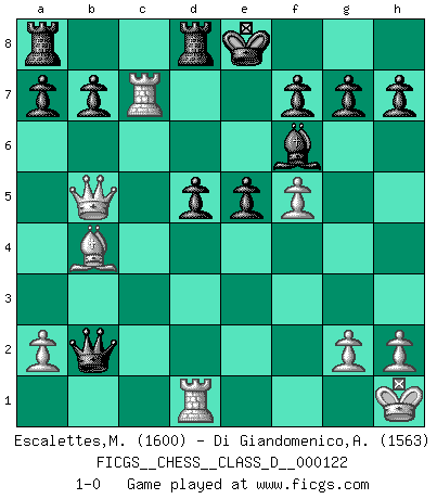 Last move : 1-0 2009 May 28 14:15:53 [Event "FICGS__CHESS__CLASS_D__000122"] [Site "FICGS"] [Date "2009.05.21"] [Round "1"] [White "Escalettes,Maurice"] [Black "Di Giandomenico,Alfonso"] [Result "1-0"] [WhiteElo "1600"] [BlackElo "1563"] 1.e4 c5 2.Nf3 e6 3.d4 cxd4 4.Nxd4 d6 5.Bb5+ Bd7 6.Bxd7+ Qxd7 7.f4 Nc6 8.O-O Nf6 9.Nxc6 Qxc6 10.f5 Nxe4 11.Kh1 e5 12.Be3 Be7 13.Qg4 Bf6 14.Nd2 Nxd2 15.Bxd2 Qxc2 16.Rfd1 Ke7 17.Bb4 Rhd8 18.Rac1 Qxb2 19.Rc7+ Ke8 20.Qc4 d5 21.Qb5+ 1-0 Sicilian defense Kingside Castling by player White (move 8) Player White won this chess game. Follow this game move after move (download)Checkers is for tramps. (Paul Morphy) Ein typischer, sehr verbreiteter Gedankenschädling ist der, daß der betreffende Amateur von der Annanhme ausgeht, daß jeder einzelne Zug etwas zu leisten habe. (Aaron Nimzowitsch) El Ajedrez es un cuento de Hadas de las 1001 metidas de pata. (Savielly Tartakower) Des idées, des idées, j'en ai cent, j'en ai mille. Des bonnes, des mauvaises, applicables, irréalisables... Il suffit de faire le tri ! (Roos) Happy endings are just stories that haven't finished yet. (Jane Smith in Mr & Mrs Smith)