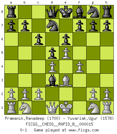 Last move : 0-1 2006 November 6 3:21:31 [Event "FICGS__CHESS__RAPID_B__000015"] [Site "FICGS"] [Date "2006.09.12"] [Round "1"] [White "Pramanik,Ranadeep"] [Black "Yuvarlak,Ugur"] [Result "0-1"] [WhiteElo "1700"] [BlackElo "1578"] 1.e4 c6 2.f4 d5 3.e5 Bf5 4.d4 e6 5.Be3 Nd7 6.Bd3 Bxd3 0-1 This chess game has been lost on time (started : 2006.09.12 15:9:17) Caro-Kann defense Player Black won this chess game. Follow this game move after move (download)Nowadays, when you're not a grandmaster at 14, you can forget about it. (Anand Viswanathan) Das Schach ist nichts für kleine Geister, es beansprucht einen vollen Mann, der sich nicht sklavisch an das Überlieferte hält, sondern selbständig die Tiefen des Spiels zu ergründen sucht. (Wilhelm Steinitz) Me gusta decir que Bobby Fischer fue el mejor jugador que jamás haya existido. Pero lo que hizo de Fischer un genio, fue su habilidad de mezclar una frescura y pragmatismo Americano con ideas Rusas acerca de la estrategia. (Bruce Pandolfini) Les Echecs ont trois composantes : le temps, l'espace et le matériel en dernier. (Mikhail Tal) Convictions are more dangerous enemies of truth than lies. (Friedrich Nietzsche)