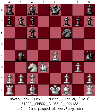 Last move : 1-0 2009 July 27 11:44:32 [Event "FICGS__CHESS__CLASS_D__000122"] [Site "FICGS"] [Date "2009.05.21"] [Round "1"] [White "Davis,Mark"] [Black "Murray,Findlay"] [Result "1-0"] [WhiteElo "1492"] [BlackElo "1648"] 1.e4 e5 2.Nf3 Nc6 3.d4 exd4 4.Nxd4 Qh4 5.Nc3 Bb4 6.Qd3 Nf6 7.Nxc6 dxc6 8.g3 1-0 This chess game has been lost on time (started : 2009.05.21 0:54:21) Scotch : Steinitz variation Player White won this chess game. Follow this game move after move (download)Could we look into the head of a Chess player, we should see there a whole world of feelings, images, ideas, emotion and passion. (Alfred Binet) Kombinieren und Schwarzhandel gehören verboten. (Savielly Grigorievitsch Tartakower) El tablero es el mundo, las piezas es el fenomeno del universo, las reglas del juego son lo que llamamos leyes de la naturaleza y el jugador del lado opuesto, se encuentra oculto a nuestra vista. (Thomas Huxley) Un millionnaire : 'Monsieur Steinitz ! Vous ne participez aux tournois que pour l'argent, alors que moi je n'y viens que pour l'honneur.' Steinitz : 'Chacun joue pour ce qu'il n'a pas'... Perfection is achieved, not when there is nothing more to add, but when there is nothing left to take away. (Antoine de Saint-Exupéry)