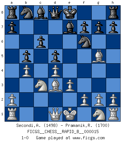 Last move : 1-0 2006 November 5 9:16:6 [Event "FICGS__CHESS__RAPID_B__000015"] [Site "FICGS"] [Date "2006.09.12"] [Round "1"] [White "Secondi,Alberto"] [Black "Pramanik,Ranadeep"] [Result "1-0"] [WhiteElo "1498"] [BlackElo "1700"] 1.d4 d5 2.c4 c6 3.Nc3 Nf6 4.Bg5 e6 5.cxd5 exd5 6.e3 Be7 7.Bd3 b5 8.b4 1-0 This chess game has been lost on time (started : 2006.09.12 15:9:17) QGD Slav defense Player White won this chess game. Follow this game move after move (download)It is the aim of the modern school, not to treat every position according to one general law, but according to the principle inherent in the position. (Richard Reti) Lisa Lane, amerikanische Schachmeisterin, hatte Fischer einmal als stärksten lebenden Spieler bezeichnet. Antwort: Das ist richtig, aber Lisa Lane ist eigentlich nicht in der Lage, das zu beurteilen. (Robert James Fischer) El Ajedrez es un terrible juego. Si no controlas el centro, tu oponente tiene una posición mas holgada. Si tienes control del centro, ¡entonces realmente tu tienes algo de que preocuparte!. (Siegbert Tarrasch) Un footballeur joue avec ses pieds, parfois avec sa tête. Un joueur d'échecs ne joue qu'avec sa tête. Et quand il ne joue plus, il meurt. (Jacob Murray) You have to believe in yourself. (Sun Tzu)