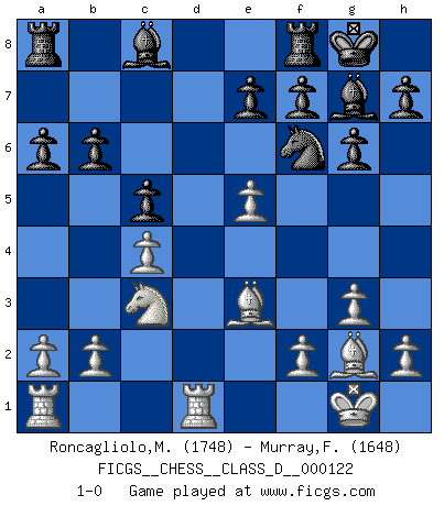 Last move : 1-0 2009 May 21 16:22:56 [Event "FICGS__CHESS__CLASS_D__000122"] [Site "FICGS"] [Date "2009.05.21"] [Round "1"] [White "Roncagliolo,Marco"] [Black "Murray,Findlay"] [Result "1-0"] [WhiteElo "1748"] [BlackElo "1648"] 1.Nf3 Nf6 2.g3 c5 3.Bg2 Nc6 4.O-O g6 5.c4 Bg7 6.Nc3 O-O 7.d4 cxd4 8.Nxd4 Nxd4 9.Qxd4 d6 10.Rd1 a6 11.e4 Qa5 12.Bd2 Qc5 13.Qxc5 dxc5 14.Be3 b6 15.e5 1-0 Reti Opening Kingside Castling by player White (move 4) Kingside Castling by player Black (move 6) Player White won this chess game. Follow this game move after move (download)Though most people love to look at the games of the great attacking masters, some of the most successful players in history have been the quiet positional players. They slowly grind you down by taking away your space, tying up your pieces, and leaving you with virtually nothing to do ! (Yasser Seirawan) Sitze auf Deine Hände. (Siegbert Tarrasch) La mitad de las variaciones que son calculadas en una partida de torneo, resultan ser completamente superfluas. Desafortunadamente, nadie sabe por adelantado cual mitad. (Jan Tinman) Aux échecs, l'amour-propre est satisfait quand on remporte la victoire, mais il n'y a pas de honte à être battu. (Benjamin Franklin) God is an atheist. (Unknown)