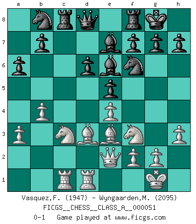 Last move : 0-1 2009 September 30 20:33:28 [Event "FICGS__CHESS__CLASS_A__000051"] [Site "FICGS"] [Date "2009.05.21"] [Round "1"] [White "Vasquez,Fernando"] [Black "Wyngaarden,Martin"] [Result "0-1"] [WhiteElo "1947"] [BlackElo "2095"] 1.e4 c5 2.d4 cxd4 3.c3 dxc3 4.Nxc3 Nc6 5.Nf3 e6 6.Bc4 d6 7.O-O Be7 8.Qe2 Nf6 9.Rd1 e5 10.Be3 O-O 11.h3 Be6 12.Bb5 Qc7 13.Ng5 Bd7 14.Rac1 a6 15.Bd3 Qd8 16.Nf3 Rc8 17.a3 Be6 18.b4 Nb8 0-1 This chess game has been lost on time (started : 2009.05.21 14:16:37) Sicilian : Smith-Morra gambit Kingside Castling by player White (move 7) Kingside Castling by player Black (move 10) Player Black won this chess game. Follow this game move after move (download)The beauty of a move lies not in its' appearance but in the thought behind it. (Siegbert Tarrasch) Um dein Spiel zu verbessern musst du zuallererst das Endspiel studieren, denn diese kann unabhängig studiert werden. Die Eröffnung und das Mittelspiel müssen immer in Bezug gesetzt werden zum Endspiel. (José Raúl Capablanca) Fischer es una tragedia del Ajedrez Americano a la par con Morphy y Pillsbury. (Mig Greengard) Le profane ne songe pas à la somme de jouissance dont il se prive, qui méconnaît ce jeu aux ressources aussi variées que passionnantes. (Jean-Marie Jeanton-Lamarche) The intuitive mind is a sacred gift; the rational mind is a faithful servant. We have created a society that honors the servant but has forgotten the gift. (Albert Einstein)