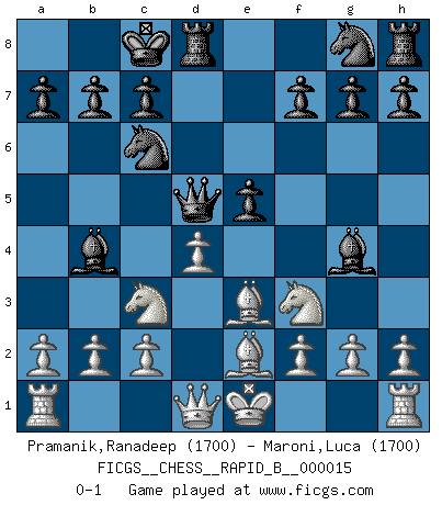 Last move : 0-1 2006 November 5 15:19:19 [Event "FICGS__CHESS__RAPID_B__000015"] [Site "FICGS"] [Date "2006.09.12"] [Round "1"] [White "Pramanik,Ranadeep"] [Black "Maroni,Luca"] [Result "0-1"] [WhiteElo "1700"] [BlackElo "1700"] 1.e4 d5 2.exd5 Qxd5 3.d4 Nc6 4.Be3 e5 5.Nf3 Bg4 6.Be2 O-O-O 7.Nc3 Bb4 0-1 This chess game has been lost on time (started : 2006.09.12 15:9:17) Scandinavian (centre counter) defense Queenside Castling by player Black (move 6) Player Black won this chess game. Follow this game move after move (download)We don't really know how the game was invented, though there are suspicions. As soon as we discover the culprits, we'll let you know. (Bruce Pandolfini) Es hat in meinem Leben Zeiten gegeben, da ich sehr nahe daran war zu glauben, daß ich auch nicht eine einzige Schachpartie verlieren könnte. (José Raúl Capablanca) Mis oponentes también hacen buenas movidas. A veces yo no tomo esas cosas en consideración. (Bobby Fischer) Il vaut toujours mieux jouer un plan faux de façon logique que de n'avoir pas de plan du tout. (Victor Kortchnoï) Mac users swear by their computers. PC users swear at their computers. (Author unknown)