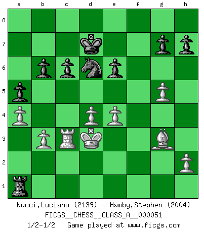 Last move : 1/2-1/2 2010 January 4 23:59:17 [Event "FICGS__CHESS__CLASS_A__000051"] [Site "FICGS"] [Date "2009.05.21"] [Round "1"] [White "Nucci,Luciano"] [Black "Hamby,Stephen"] [Result "1/2-1/2"] [WhiteElo "2139"] [BlackElo "2004"] 1.d4 Nf6 2.Nf3 e6 3.c4 Bb4+ 4.Bd2 Qe7 5.g3 Nc6 6.Nc3 d5 7.a3 Bxc3 8.Bxc3 dxc4 9.Qa4 O-O 10.Bg2 Rd8 11.O-O Qd7 12.Qxc4 Qd5 13.Qd3 Qf5 14.Rad1 Qxd3 15.Rxd3 Ne7 16.Rc1 Bd7 17.Ba5 b6 18.Ne5 Bb5 19.Bxa8 Rxa8 20.Bb4 Bxd3 21.Nxd3 Ned5 22.Be1 Ne8 23.e4 Ne7 24.Ne5 f6 25.Nc6 Nxc6 26.Rxc6 Kf7 27.f3 a5 28.Kf2 Ke7 29.Ke3 Kd7 30.Rc3 Nd6 31.a4 f5 32.g4 fxe4 33.fxe4 Rf8 34.Bg3 Rf1 35.g5 Ra1 36.b3 c6 37.Kd3 1/2-1/2 Queen's pawn game Kingside Castling by player Black (move 9) Kingside Castling by player White (move 11) This chess game ended in a draw. Follow this game move after move (download)Every Pawn is a potential Queen. (James Mason) Schach sollte überall auf der Welt Schulfach werden. Es fördert die geistige Auseinandersetzung. Es lehrt die Demut in der Niederlage. (Garry Kasparov) Yo jugué Ajedrez con el y a veces le pude haber ganado solo que siempre devuelve su última jugada y juega la partida de manera diferente. (Mark Twain) C'est la seule position que je connaisse où les deux camps sont mals. Propos prêtés à V. Anand. He who laughs last probably does not get the joke. (Unknown)