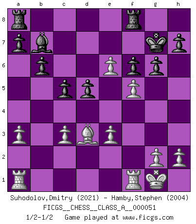 Last move : 1/2-1/2 2009 August 26 8:26:27 [Event "FICGS__CHESS__CLASS_A__000051"] [Site "FICGS"] [Date "2009.05.21"] [Round "1"] [White "Suhodolov,Dmitry"] [Black "Hamby,Stephen"] [Result "1/2-1/2"] [WhiteElo "2021"] [BlackElo "2004"] 1.d4 Nf6 2.c4 e6 3.Nc3 Bb4 4.e3 O-O 5.Bd3 d5 6.Nf3 c5 7.O-O b6 8.cxd5 exd5 9.Ne5 Bb7 10.Bd2 Nc6 11.a3 Bxc3 12.Bxc3 Nxe5 13.dxe5 Ne4 14.f4 Nxc3 15.bxc3 Qe7 16.Qh5 g6 17.Qh6 f6 18.f5 Qg7 19.Qxg7+ Kxg7 20.e6 1/2-1/2 Nimzo-Indian : 4.e3 O-O, 5.Bd3 d5 Kingside Castling by player Black (move 4) Kingside Castling by player White (move 7) This chess game ended in a draw. Follow this game move after move (download)Robert Fischer is a law unto himself. (Larry Evans) Stil? Ich habe keinen Stil! (Anatoly Karpov) La mitad de las variaciones que son calculadas en una partida de torneo, resultan ser completamente superfluas. Desafortunadamente, nadie sabe por adelantado cual mitad. (Jan Tinman) Un millionnaire : 'Monsieur Steinitz ! Vous ne participez aux tournois que pour l'argent, alors que moi je n'y viens que pour l'honneur.' Steinitz : 'Chacun joue pour ce qu'il n'a pas'... Is not life a hundred times too short to bore ourselves ? (Friedrich Nietzsche)