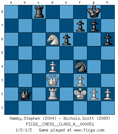 Last move : 1/2-1/2 2009 October 4 9:22:2 [Event "FICGS__CHESS__CLASS_A__000051"] [Site "FICGS"] [Date "2009.05.21"] [Round "1"] [White "Hamby,Stephen"] [Black "Nichols,Scott"] [Result "1/2-1/2"] [WhiteElo "2004"] [BlackElo "2089"] 1.d4 d5 2.c4 dxc4 3.Nf3 Nf6 4.Qa4+ Nc6 5.Nc3 e6 6.Qxc4 Nb4 7.Qb3 c5 8.e3 cxd4 9.exd4 Be7 10.Bg5 Nc6 11.Rd1 O-O 12.Bd3 h6 13.Bh4 Nd5 14.Bxe7 Ncxe7 15.O-O Bd7 16.Nxd5 Nxd5 17.Qxb7 Rb8 18.Qxa7 Nf4 19.Rfe1 Bc6 20.Be4 Bxe4 21.Rxe4 Nd5 22.Re2 Ra8 23.Qc5 Rxa2 24.Ne5 Qa8 25.Qc1 Rc8 26.Rc2 Rxc2 27.Qxc2 Nf4 28.f3 Qb7 29.Nc4 Ra8 30.Kf2 Nd5 31.Qd3 Rc8 32.Nd6 Qxb2+ 33.Rd2 Nf4 1/2-1/2 QGA : Mannheim variation Kingside Castling by player Black (move 11) Kingside Castling by player White (move 15) This chess game ended in a draw. Follow this game move after move (download)Who is your opponent tonight, tonight I am playing against the Black pieces. (Akiba Rubinstein) Fallen sollten polizeilich verboten werden. (Savielly Grigorievitsch Tartakower) El Ajedrez es un mar en el cual un mosquito puede beber y un elefante puede bañarse. (Refrán Hindú) Le jeu d'échecs fait naître et fortifie en nous plusieurs qualités précieuses dans le cours de l'existence, telles que la prévoyance, la circonspection, la prudence, et la persévérance. (Benjamin Franklin - 1783, la morale des échecs) The ultimate in disposing one's troops is to be without ascertainable shape. Then the most penetrating spies cannot pry in nor can the wise lay plans against you. (Sun Tzu)